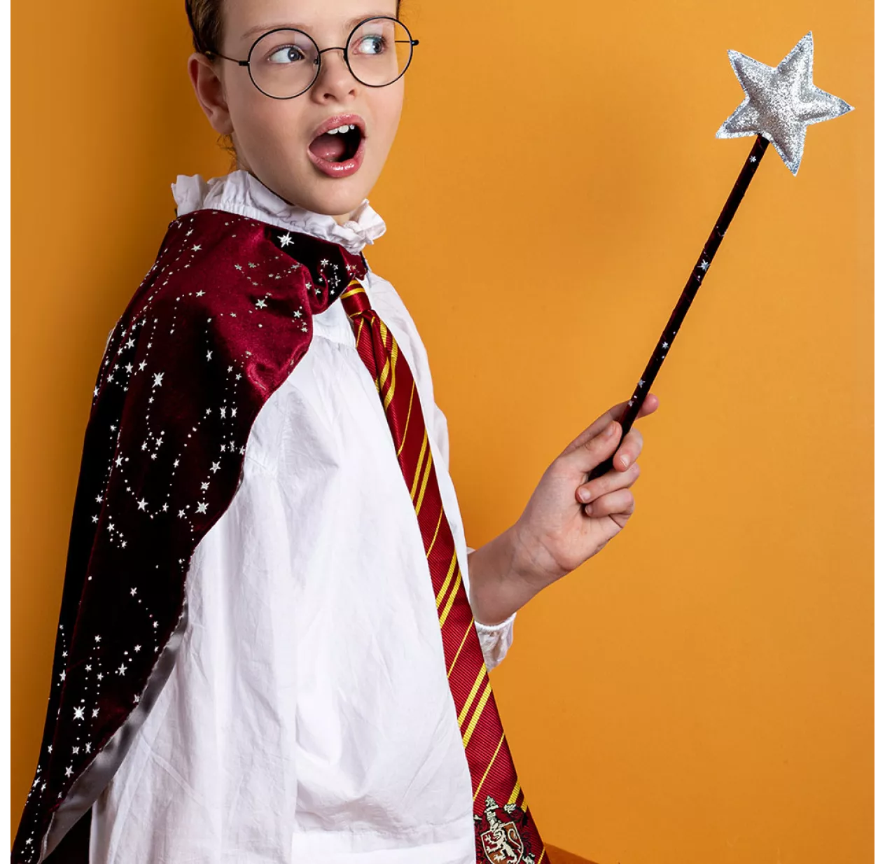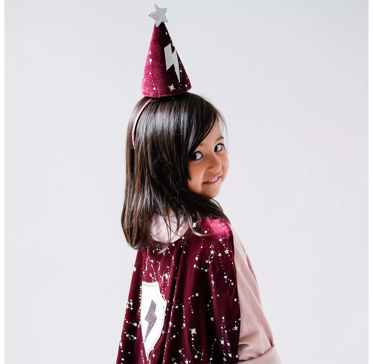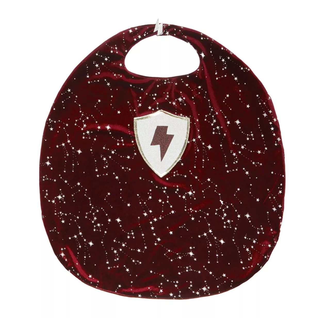Cette cape de velours bordeaux parsemée d’étoiles argentées est ornée d’un blason éclair, elle sera la meilleure alliée de vos apprentis sorciers ! A associer au chapeau et à la baguette de la même collection pour incarner un sorcier digne de ce nom !