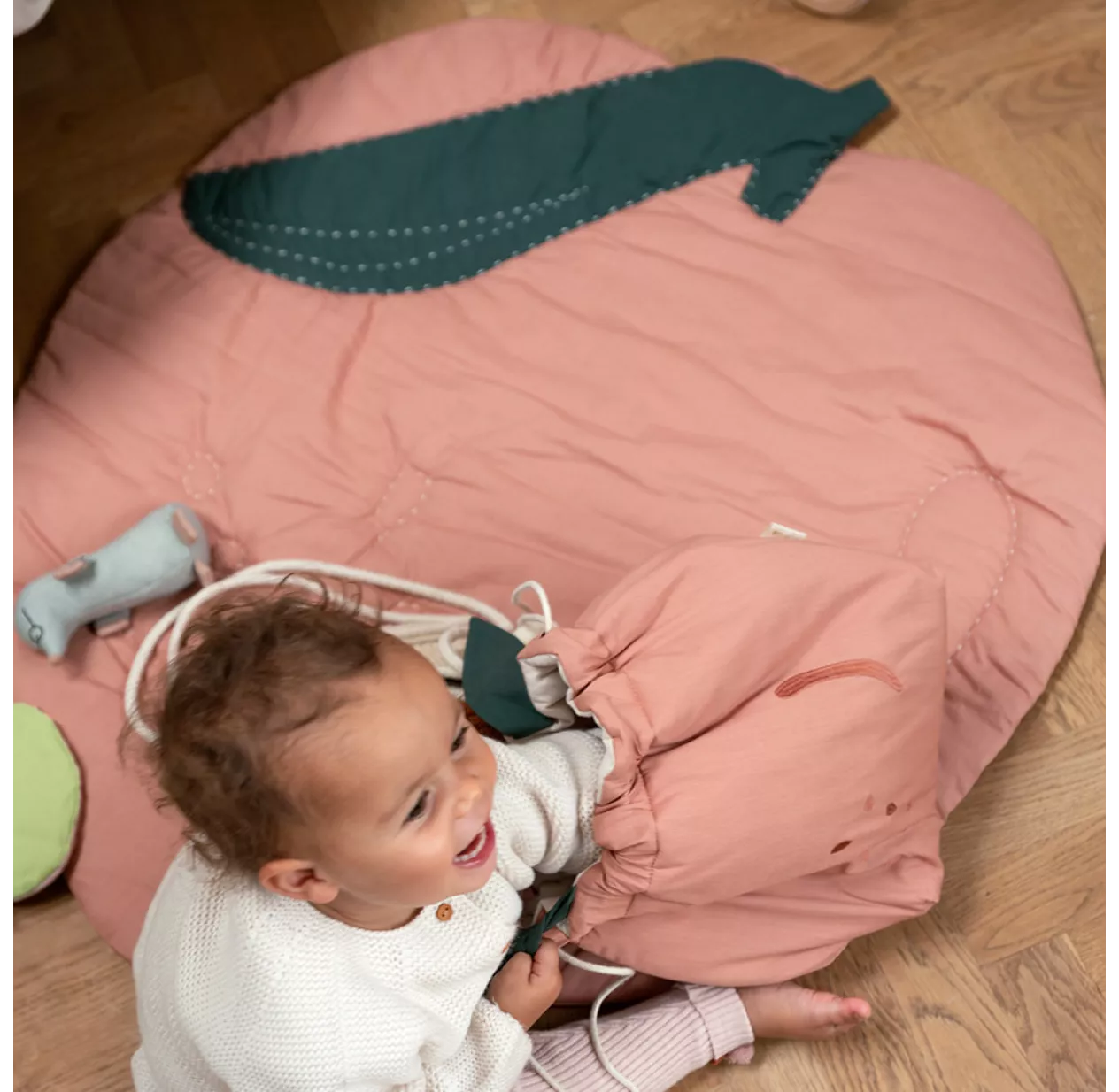 Cette couverture matelassée en forme de pêche est à croquer ! Pensée pour être multi-fonction, très déco, cette couverture est aussi un tapis de jeux idéal pour votre bébé. Vous pouvez l’associer à une arche d’éveil ou l’utiliser seule à même le sol. Elle est rembourrée d’une ouate en polyester recyclée qui la rend douillette et agréable au toucher. Le tapis de jeux Pêche de Fabelab s’associe parfaitement aux jouets d’éveil pêche, fraise et pomme de la même collection pour un éveil fruité de votre bébé !