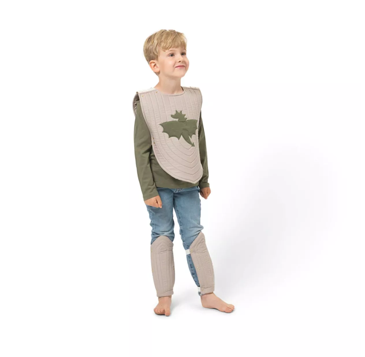 Voici l’armure des chevaliers au coeur tendre ! Constituée d’une cuirasse ornée d’un dragon et de jambières, elle est cousue de détails dorés et protège (il paraît) du feu des dragons. Toute en oton bio, l’armure Fabelab est confortable et belle. Elle s’assortie au bouclier et à l’épée Fabelab. A porter comme ça pour un Mardi Gras décontacté à l’école. Ou en total look avec une cape et un chapeau !