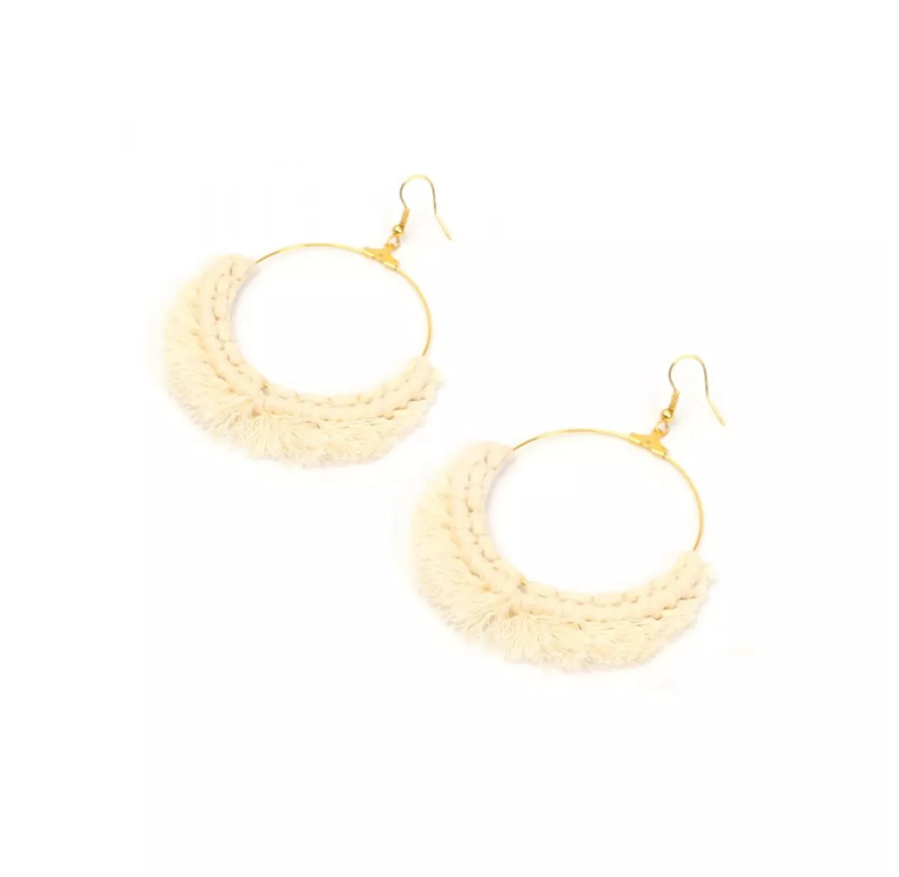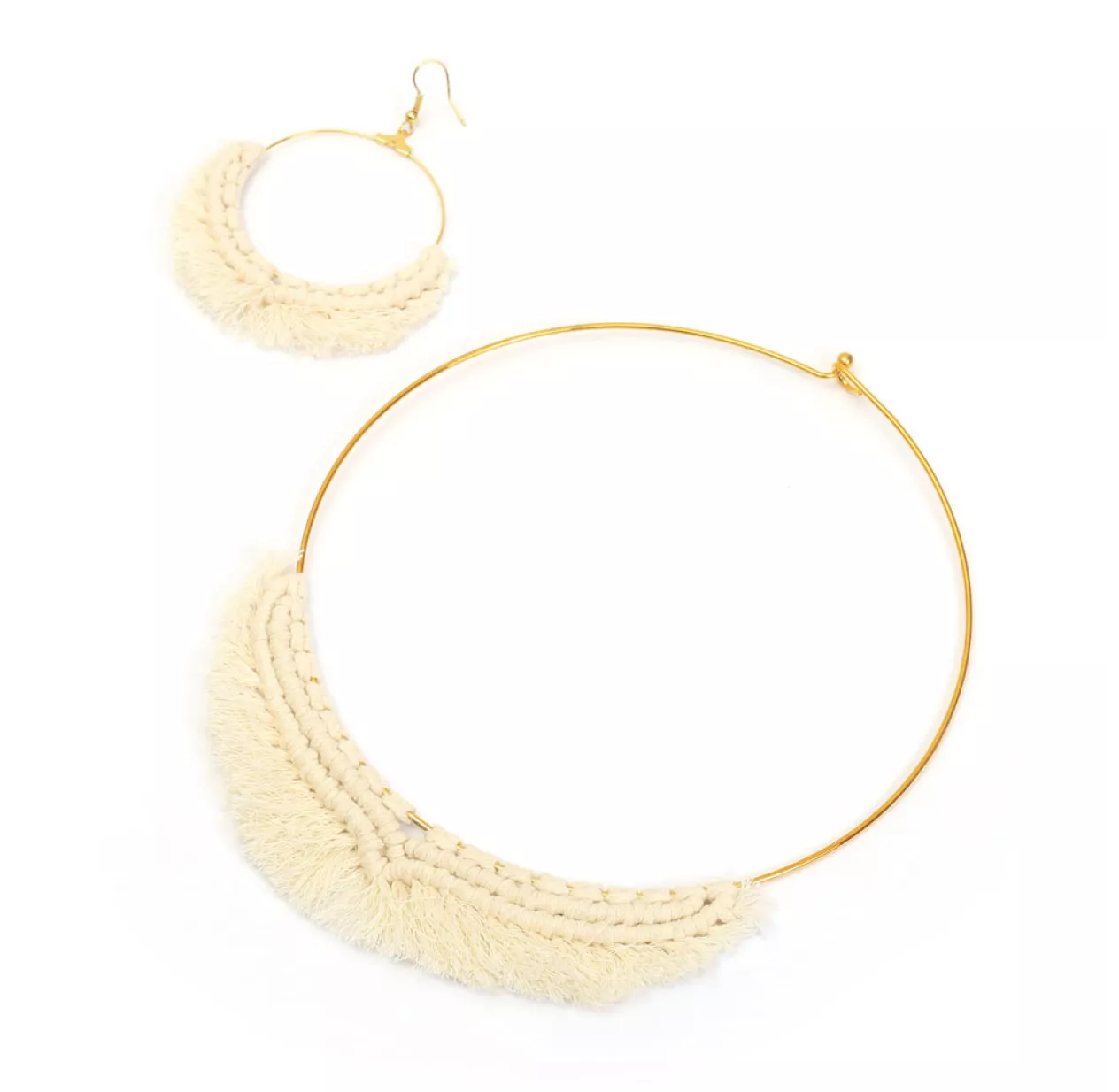 Les boucles d’oreilles en macramé Graine Créative s’associent au collier de la même collection pour une parure complète.