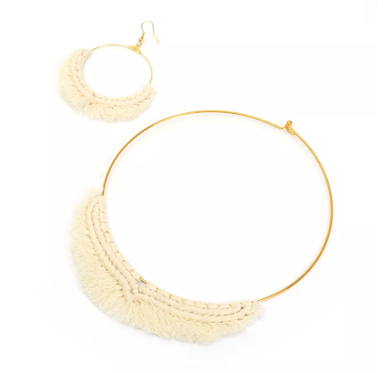 Le collier en macramé Graine Créative s’associe aux boucles d’oreilles de la même collection pour une parure complète.