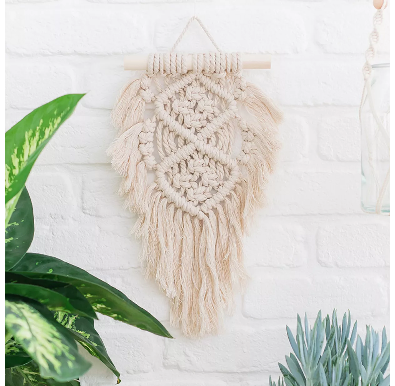 Matériel : Fil macramé en coton, 1 bâton de suspension en bois