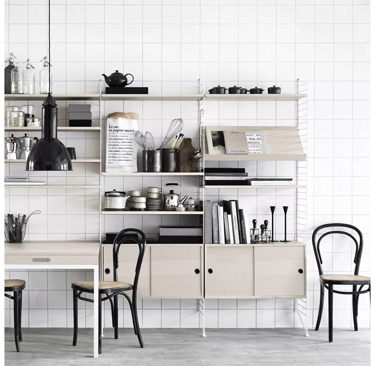 Vous pouvez également rajouter les caissons de rangement, le plateau de bureau, les étagères métalliques ou en bois, la table murale pliante et tous les autres rangements modulables String. Vous pouvez aussi mélanger les couleurs.