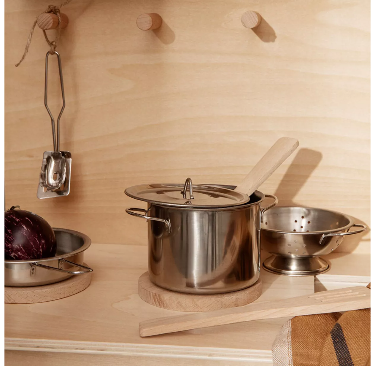 Coup de coeur pour le design minimaliste et déco du set d’ustensiles de cuisine Toro Ferm Living ! Il est constitué d’une poêle, une casserole avec couvercle, une passoir, quatre ustensiles en métal et deux en bois. Vos petits chefs seront équipés de tous les essentiels pour imaginer leurs premières recettes ! En plus d’être ludique, ce set d’ustensiles de cuisine est beat et participe à la déco de votre chambre enfant. Il s’associe à merveille avec la cuisinière Toro de Ferm Living !