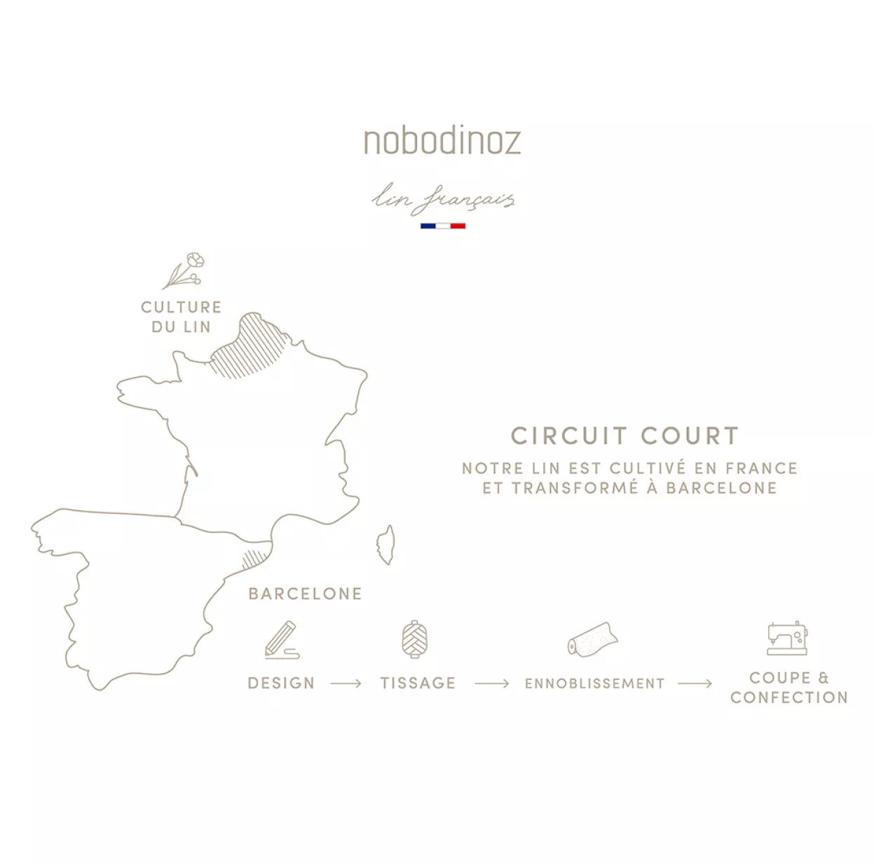 Nobodinoz a toujours misé sur la qualité et le circuit court. La marque fabrique en France et dans ses ateliers à Barcelone. Elle utilise des matières naturelles, bio ou recyclées. Sa collection Lin Français s’inscrit dans cette philosophie. Elle allie production locale et commerce responsable. Le lin Nobodinoz provient exclusivement de récoltes françaises, il est tissé, ennobli et confectionné à 50 km de nos bureaux à Barcelone. Chaque détail a été travaillé avec soin pour en faire une collection élégante et 100% responsable. Avec la collection Lin Français, Nobodinoz relève un nouveau défi technique : le lin, jusqu’alors réservé à la mode adulte et au linge de maison, devient un tissu doux et raffiné qui fait son entrée dans le monde de l’enfance.