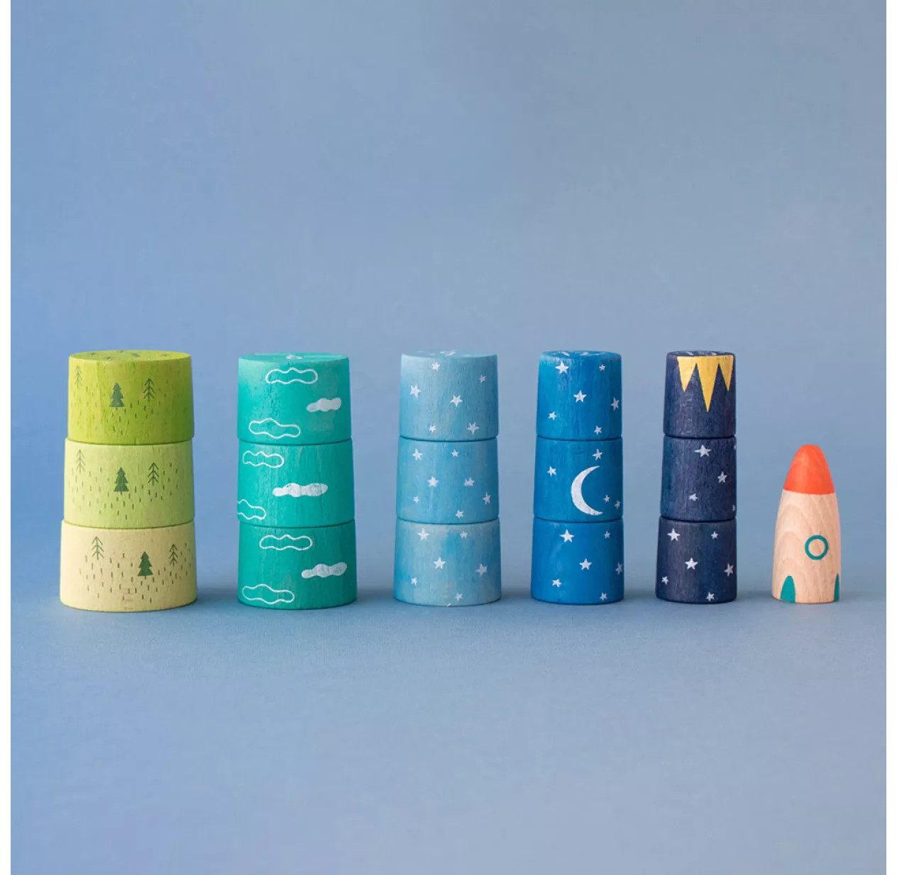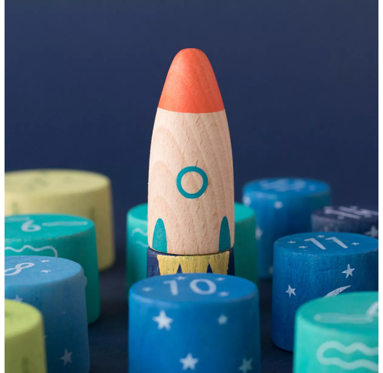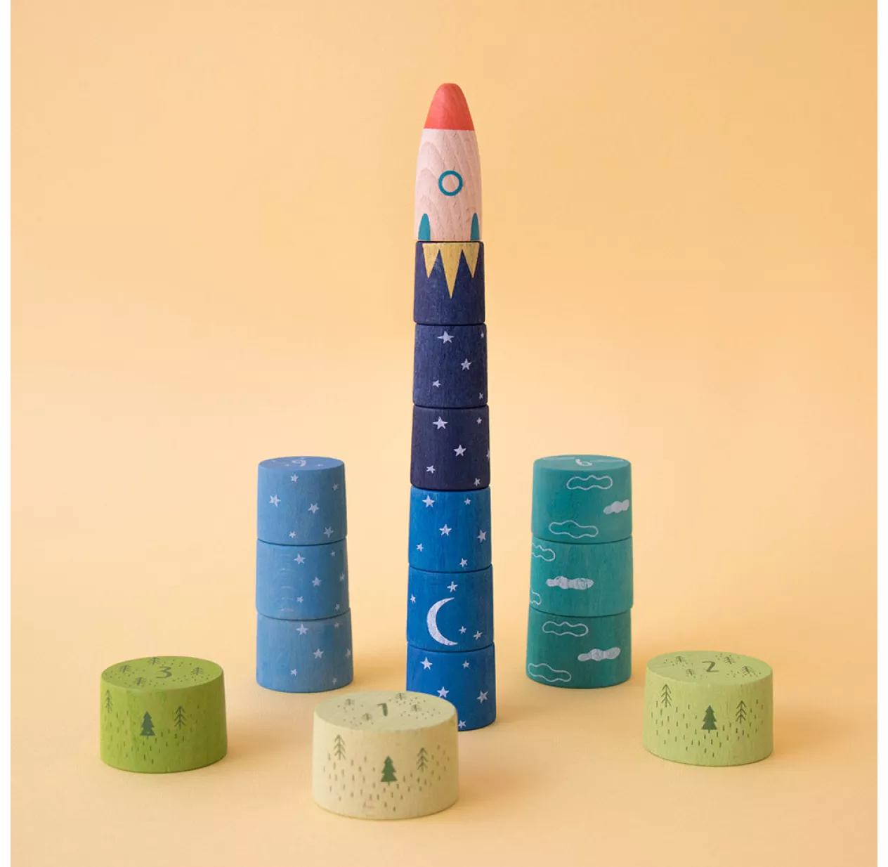Aidez la fusée à traverser les montagnes, les nuages et une partie du ciel pour atteindre les étoiles et au-delà ! Un jeu d’adresse et d’équilibre pour les enfants de 3 à 103 ans. Cette magnifique fusée en bois est ludique et belle, à garder sur une étagère en objet déco !