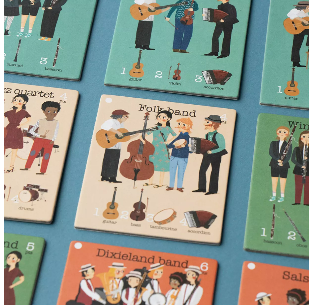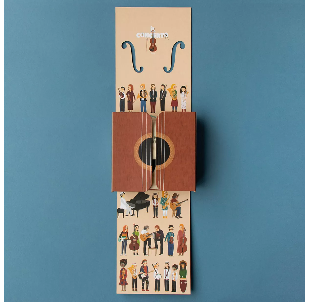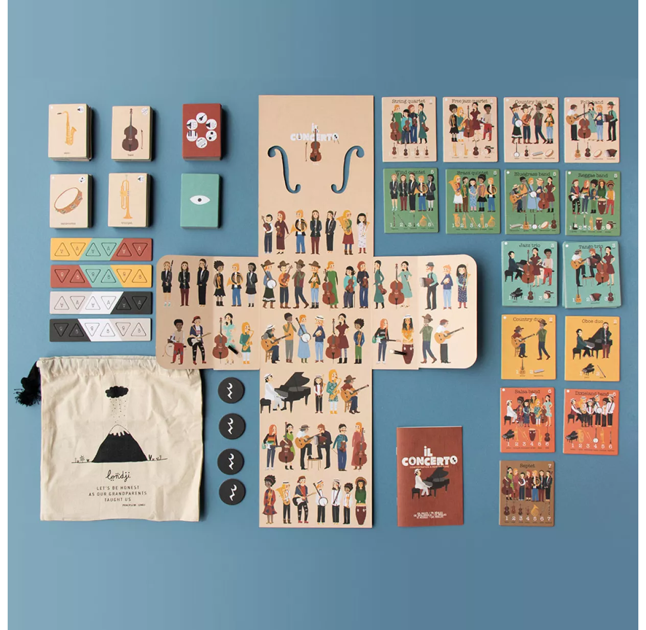 Il était une fois des musiciens, des violonistes, des guitaristes, des pianistes… Ils cherchaient tous un groupe pour jouer de la musique ! Le jeu Il Concerto de Londji est un jeu de mémoire dont l’objectif est de compléter le plus grand nombre de groupes musicaux. Pour cela il faut désigner tous les instruments qui font partie du groupe. Par la polyvalence des supports, d’autres propositions de jeux peuvent être facilement créées pour accompagner l’apprentissage musical. Il peut être joué avec deux niveaux de difficulté : la version réduite pour les instruments classiques et la version complète pour jouer avec toutes sortes de groupes musicaux.