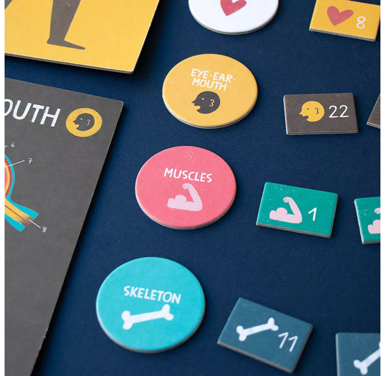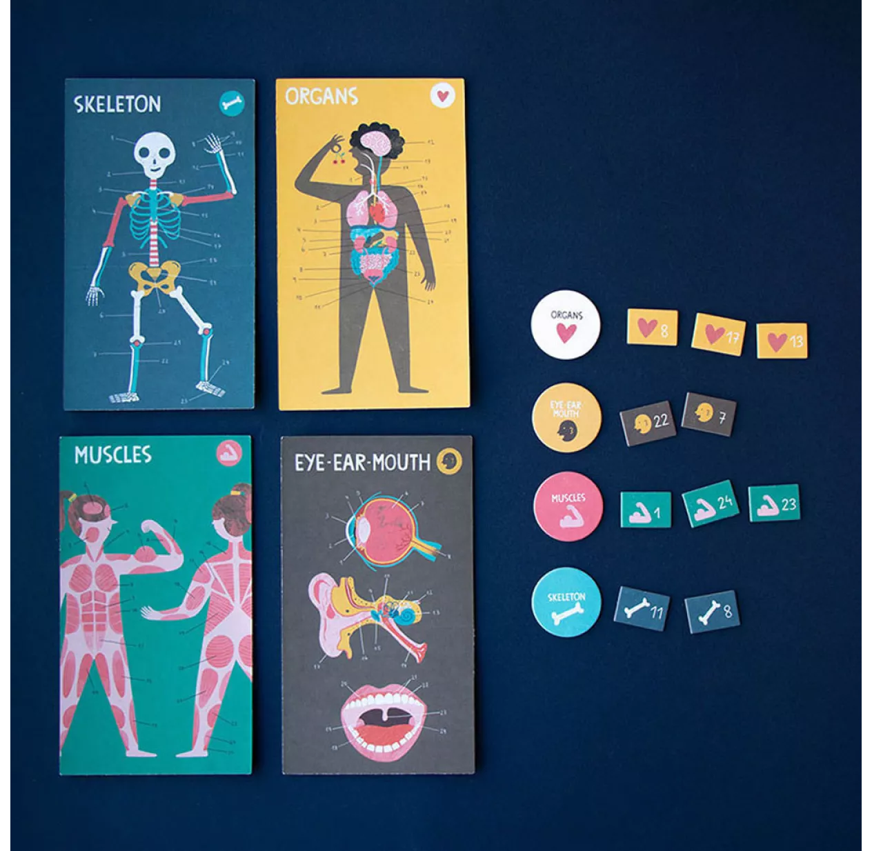 Un jeu didactique pour apprendre le nom et la position des muscles, des os et des principaux organes du corps humain. Un jeu conçu et fabriqué à Barcelone.