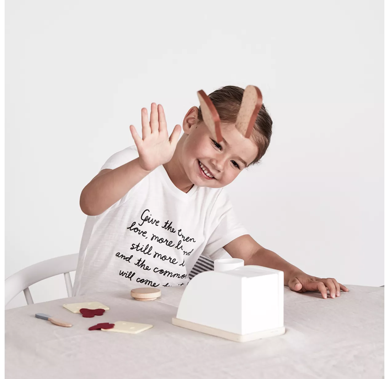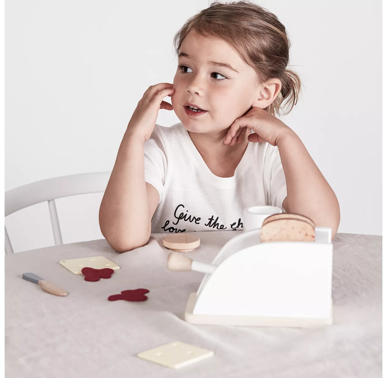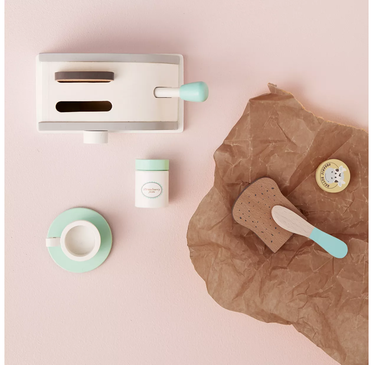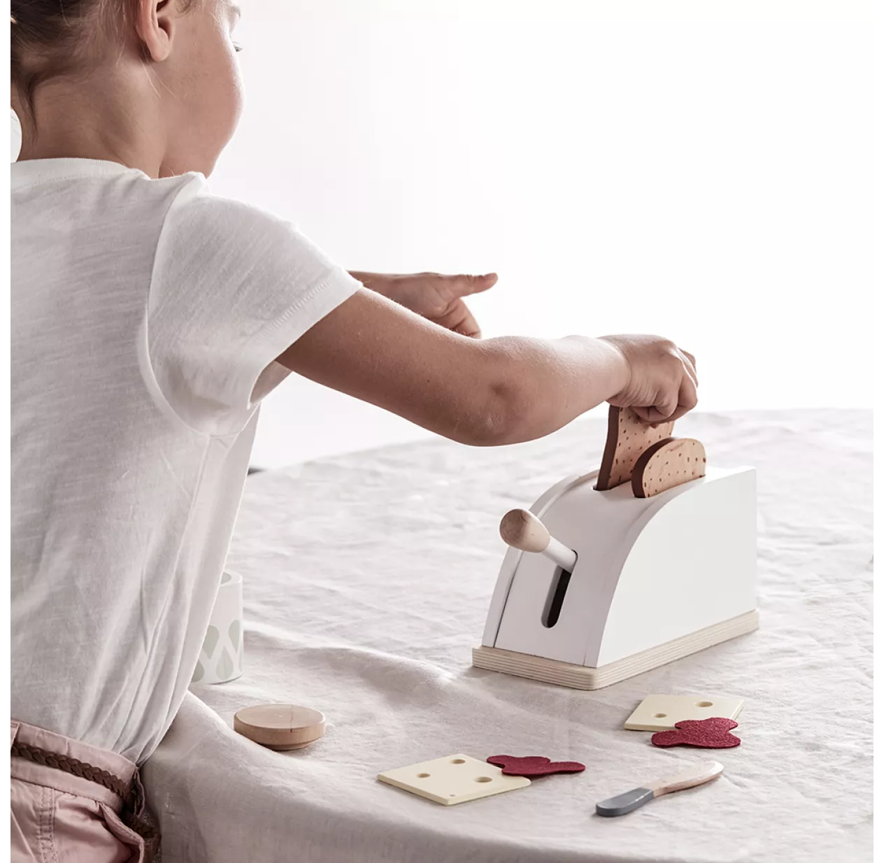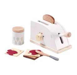 Mettez les tranches de pain dans le grille-pain, tournez le bouton pour régler la chaleur. C’est prêt ! Actionnez le levier pour sortir les tranches de pain grillées. Nous vous souhaitons un bon petit déjeuner ! Le grille-pain est un jouet en bois très amusant, qui développe l’imagination des enfants. C’est un super jeu d’imitation ! Le grille-pain comprend deux tranches de pain, deux tranches de fromage, un pot de confiture, deux morceaux de confiture et un couteau à tartiner.