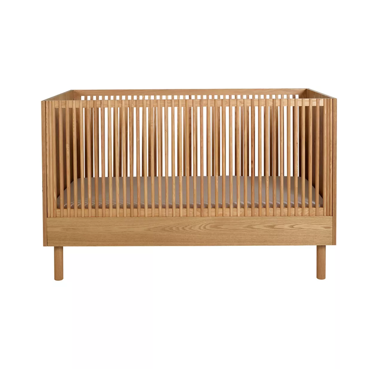 Le lit bébé évolutif Hai No Ki de Quax est élégant, pratique et durable. Coup de coeur de cette saison, ce lit bébé à barreaux d’inspiration japonisant et vintage n’est pas sans rappeler le design de Charlotte Perriand. Son couchage en 70 x 140 cm lui permet d’accueillir votre bébé plus longtemps. Il se transforme en un lit junior design avec l’ajout d’une barrière disponible en option, ce qui lui permet d’accueillir votre enfant jusqu’à 6-7 ans environ. Son sommier à lattes offre un couchage confortable et qualitatif. On craque pour ses lignes épurées et sobres qui font de ce lit évolutif un joli meuble au style intemporel. Il se transforme aussi en une banquette rétro en retirant simplement l’un des côté du lit. Le lit bébé évolutif Hai No Ki de Quax s’associe parfaitement à la commode ou à l’armoire de la même collection pour une chambre bébé complète.