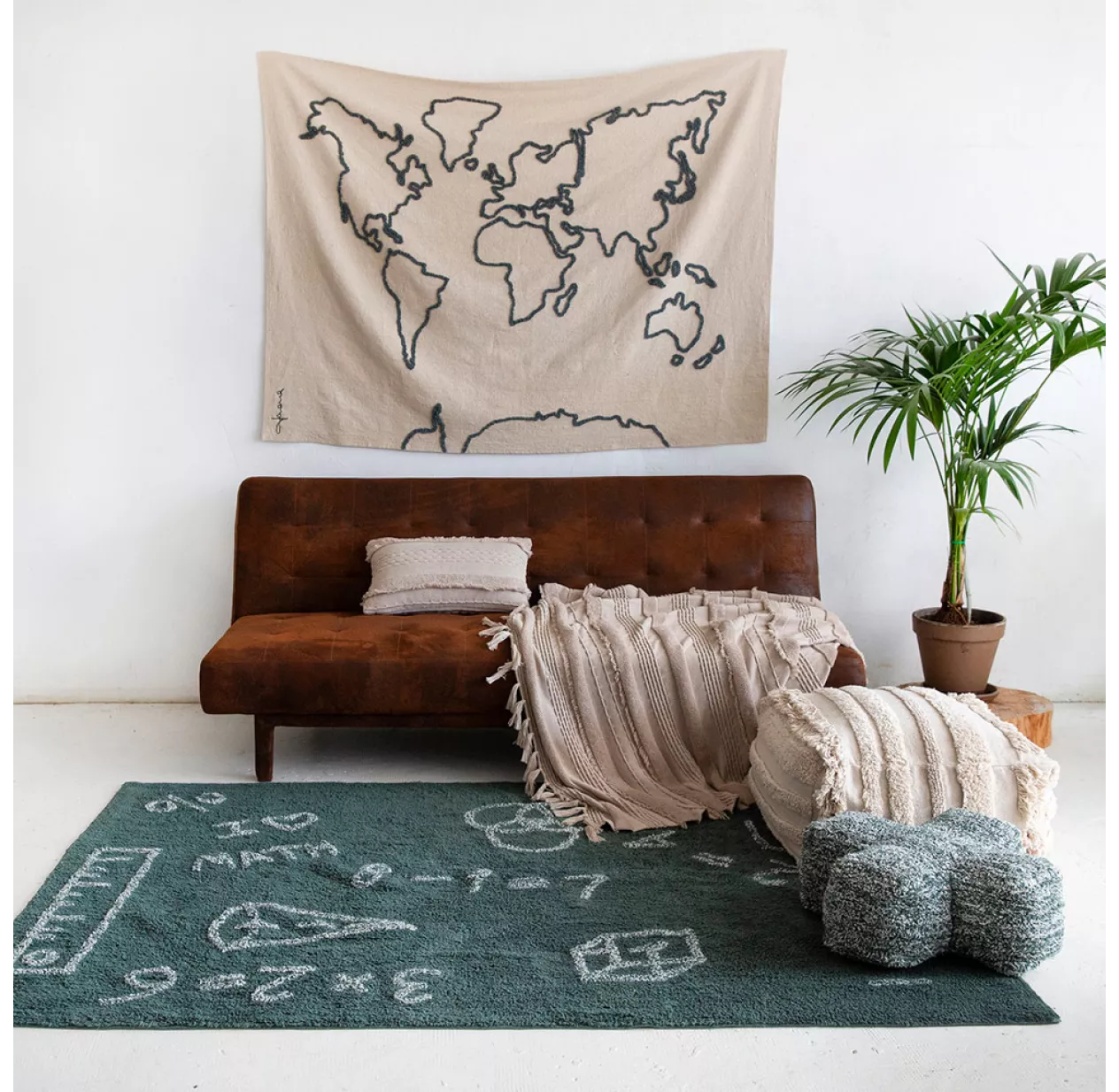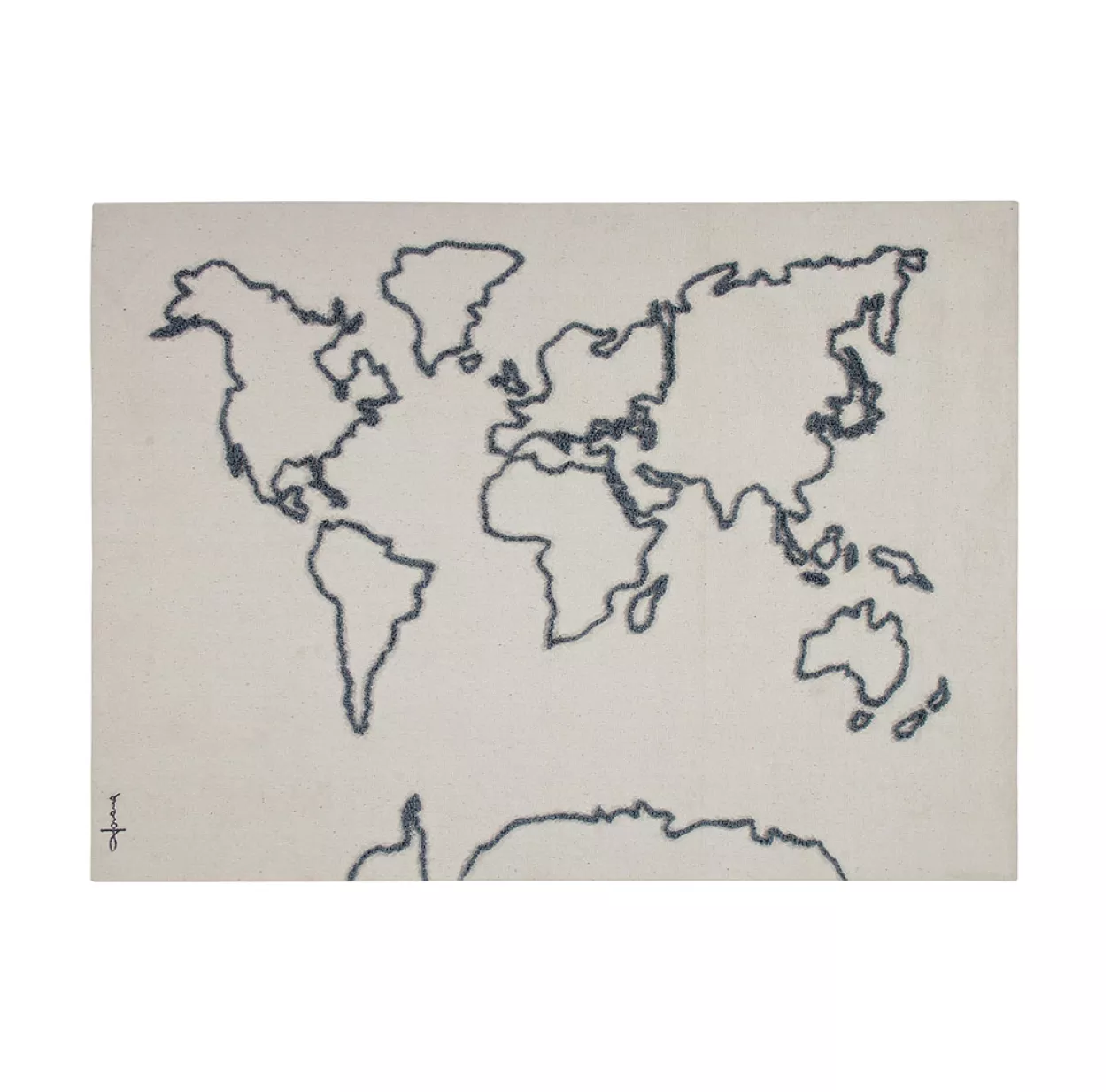 Ce tapis mural reprĂ©sentant une carte du monde est emblĂ©matique de la collection Back to School de Lorena Canals. Le dessin noir se dĂ©tache lĂ©gèrement du fond grace Ă des fibres plus longue, crĂ©ant un relief Ă©lĂ©gant. Créé dans un coton naturel Ă la teinte Ă©crue vintage, ce tapis mural est idĂ©ale pour une chambre enfant d’aventurier en herbe. Un joli support pour leurs envies d’Ă©vasion ! C’est un tapis parfait pour le sol, mais aussi pour le mur!