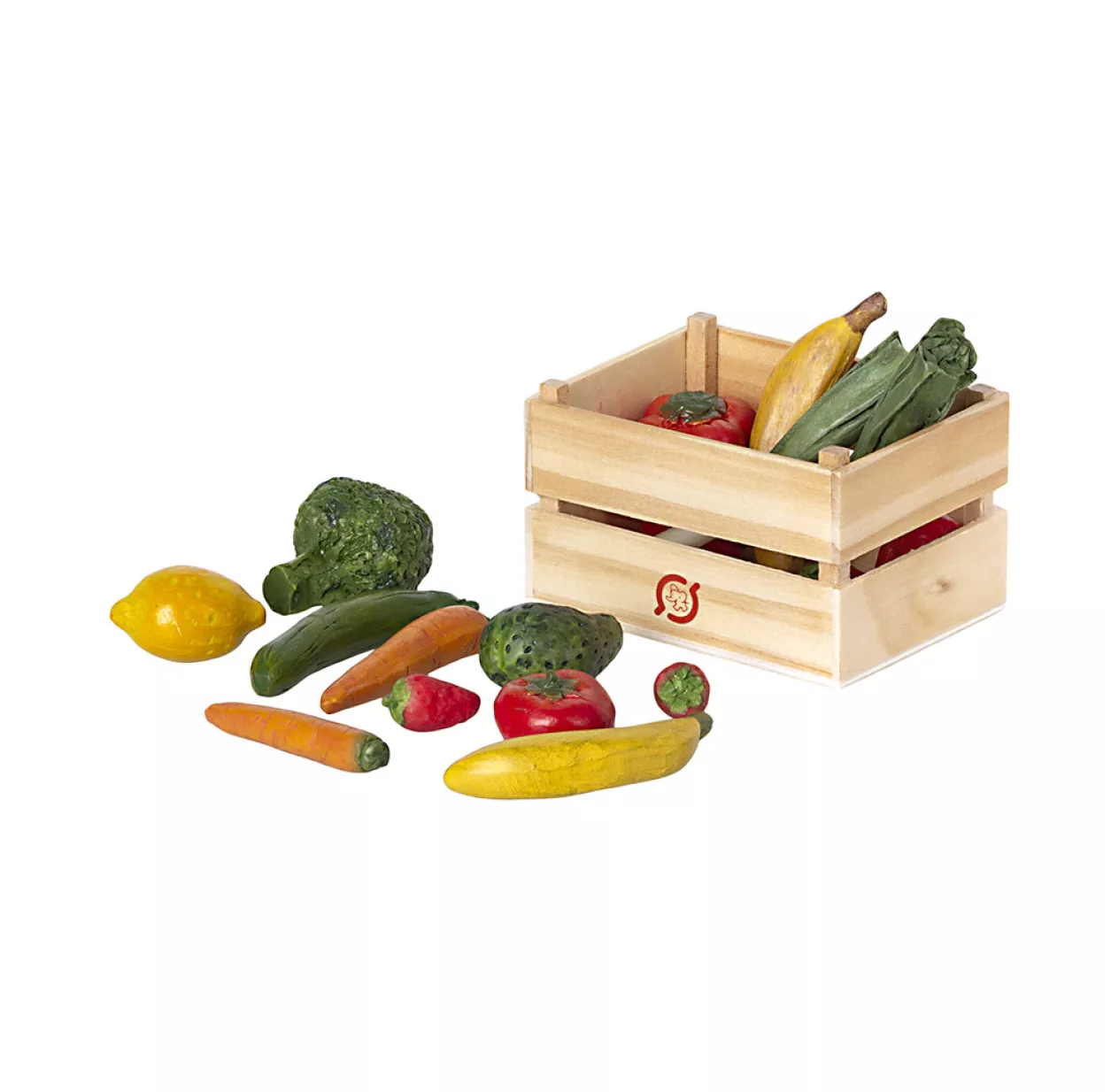 Cette adorable caisse de fruits et légumes miniature conçue pour les souris et lapins Maileg est à croquer ! Elle comprend : citron, fraise, banane, brocoli, courgette, concombre, tomate, poireau, carotte… Bref, tout ce qu’il faut pour rester en bonne santé et se mijoter de bons petits plats. Cette mini cagette de fruits et légumes s’associe à la cuisinière Maileg ou à tout autre accessoire pour petites souris et lapins Maileg. Le monde miniature de Maileg qui rappelle celui de Cendrillon, de Basile Détective ou encore de Ratatouille, est tout en minutie, détails et poésie. Un univers à compléter au fil des années, au fur et à mesure que votre enfant grandit, au fil des collections et de vos envies. Rétro, belles, poétiques et un brin désuètes, les créations Maileg sont des jouets qu’on a plaisir à offrir aux enfants tant ils nous rappellent nos jouets d’antan !
