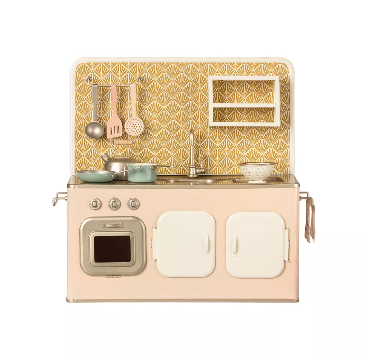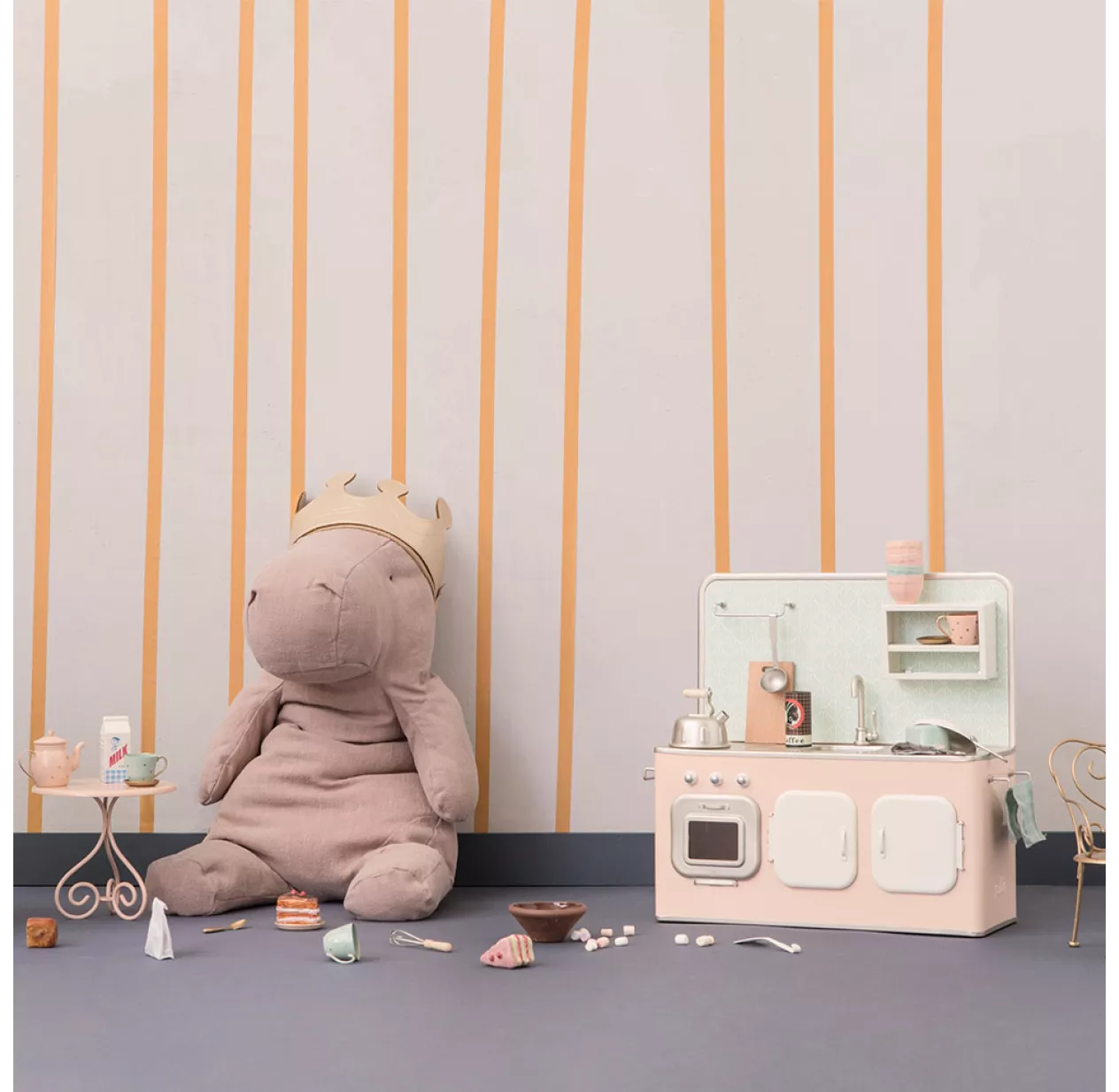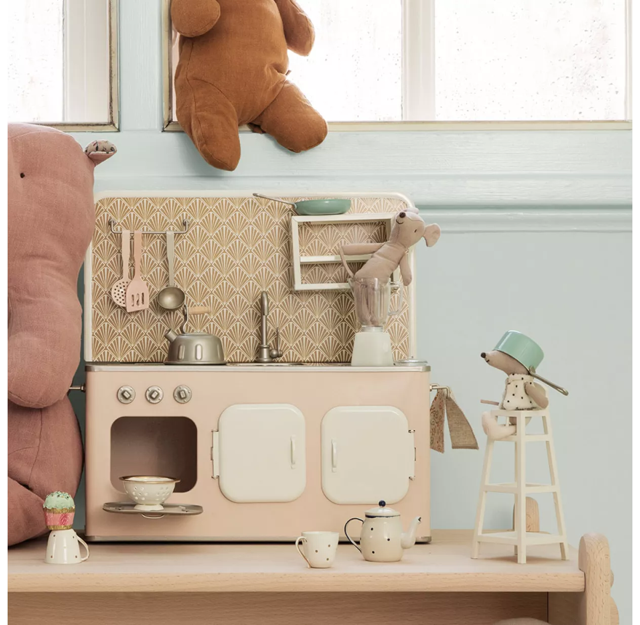 Coup de coeur inconditionnel pour cette cuisinière miniature Maileg conçue pour les souris et lapins de la marque. Elle peut s’associer à la maison de poupée Maileg ou s’utiliser telle quelle avec les autres accessoires pour petites souris et lapins Maileg. Elle est livrée avec tous ses ustensiles de cuisine: louche, spatule, écumoire, casserole, poêle, théière, passoire et torchon, pour des heures de jeu ! Le monde miniature de Maileg qui rappelle celui de Cendrillon, de Basile Détective ou encore de Ratatouille, est tout en minutie, détails et poésie. Un univers à compléter au fil des années. Au fur et à mesure que votre enfant grandit, au fil des collections et de vos envies. Rétro, belles, poétiques et un brin désuètes, les créations Maileg sont des jouets qu’on a plaisir à offrir aux enfants tant ils nous rappellent nos jouets d’antan !