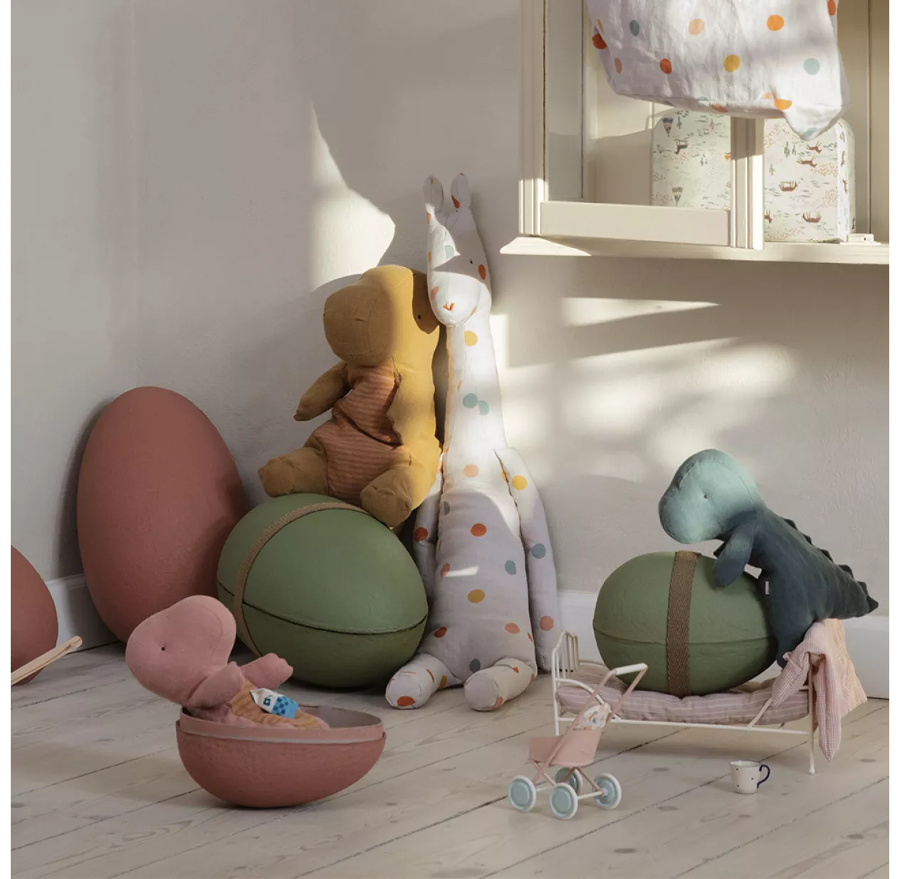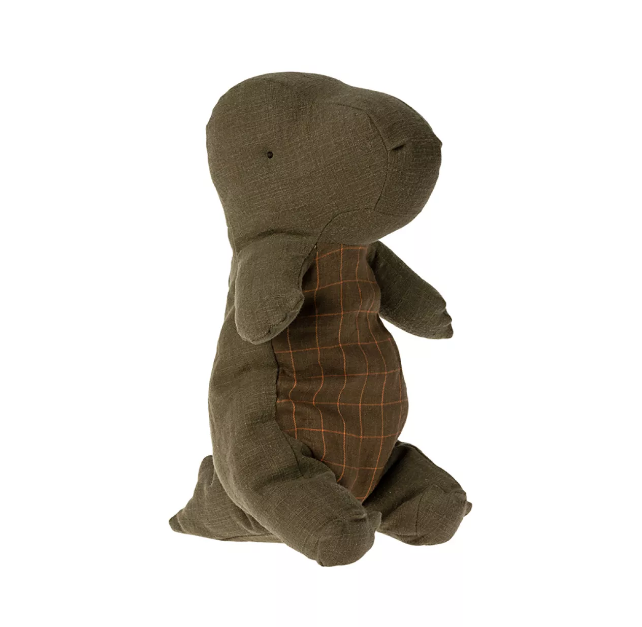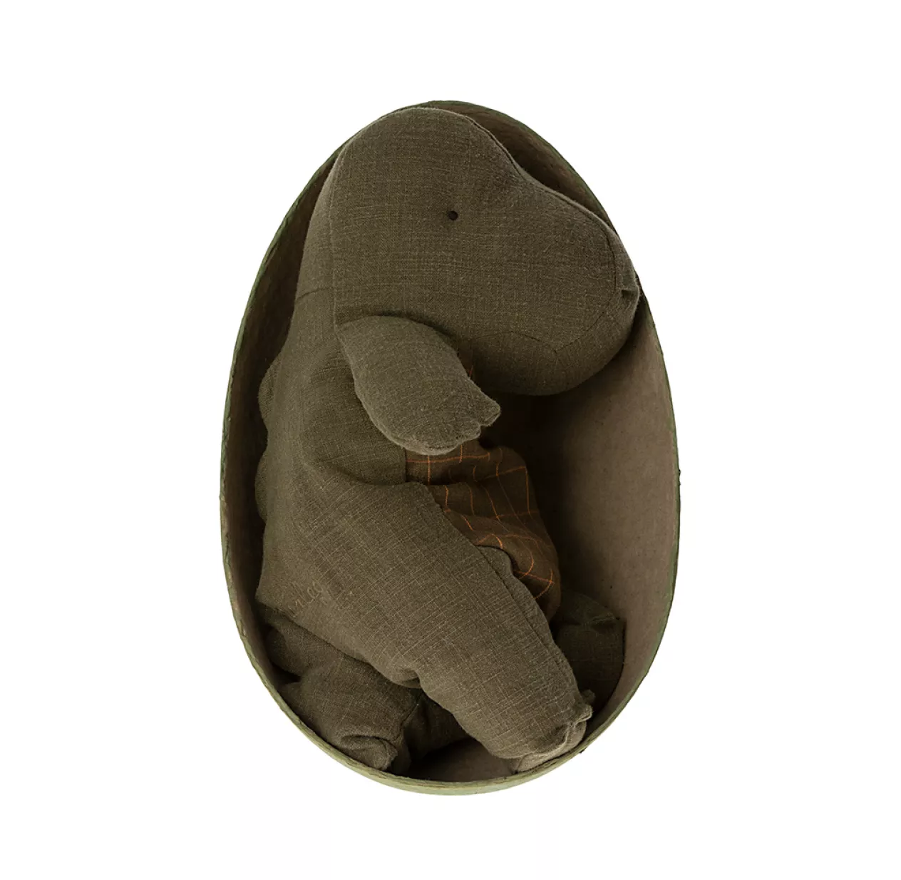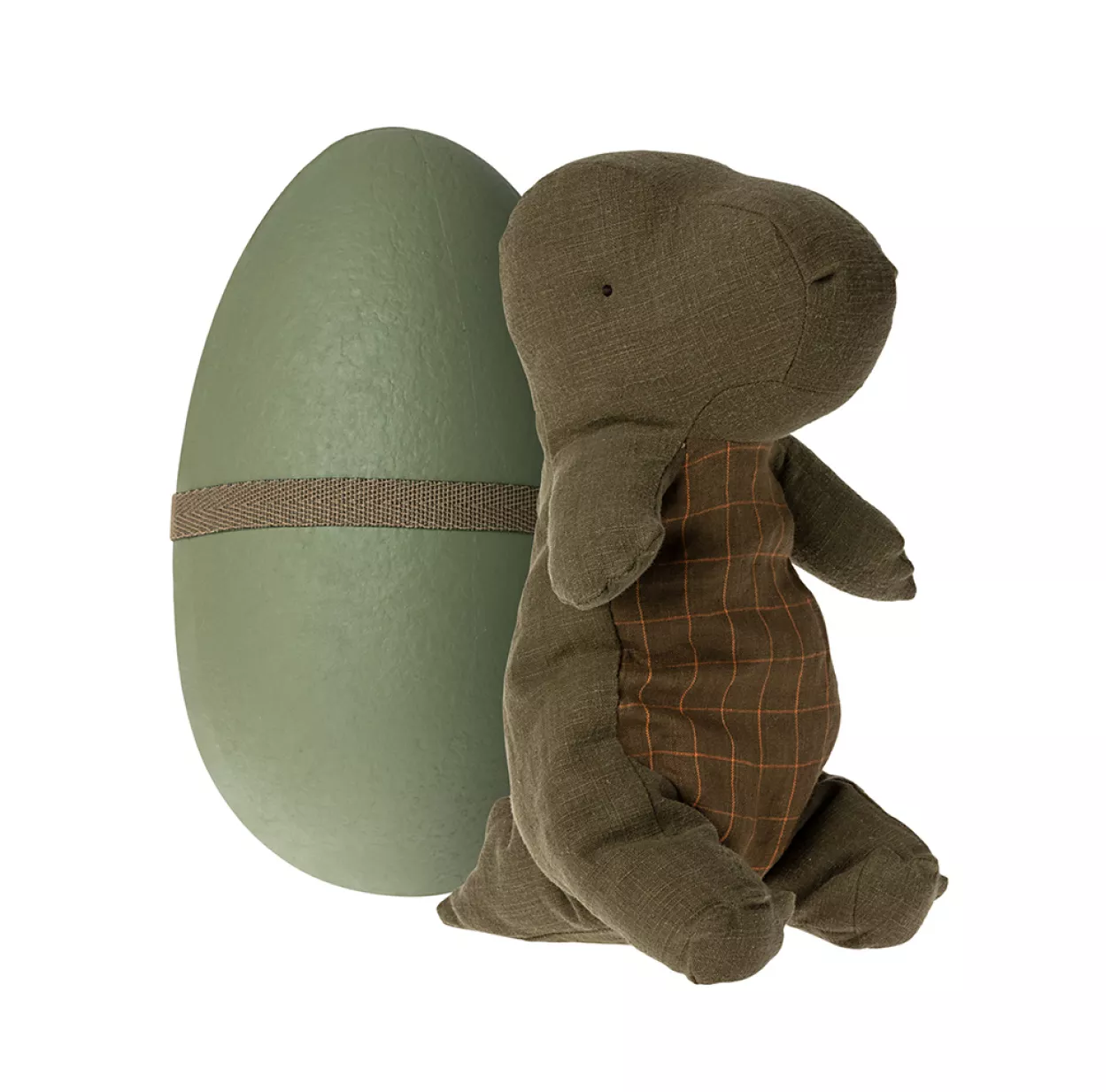 Cet adorable dinosaure en ramie et coton arrive dans son oeuf en carton : ) Un cadeau complètement craquant pour Pâques ou un anniversaire ! Taillé dans une jolie toile de ramie vert forêt, ses finitions sont très soignées. On aime ses fines rayures et carreaux sur le ventre, son extrême douceur et sa cachette ! Ce dinosaure version medium Maileg mesure 37 cm de haut. On apprécie l’utilisation du ramie, une matière qualitative, écologique et très résistante.