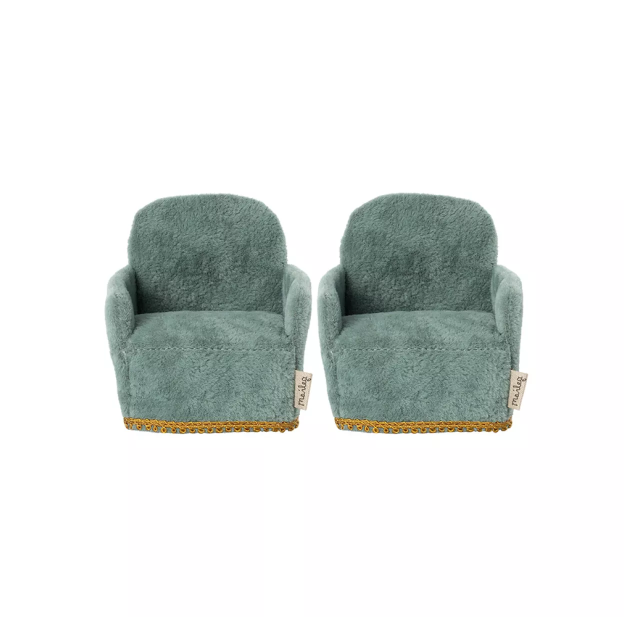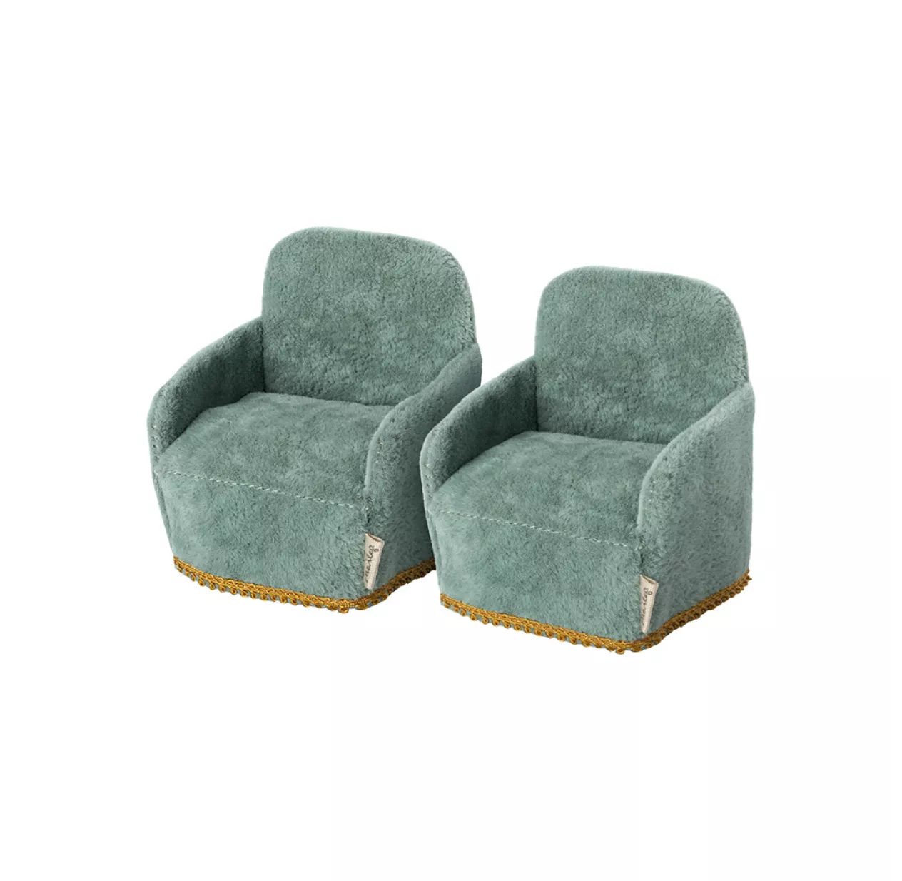 Cet ensemble de 2 fauteuils miniatures a été conçu pour les souris et lapins Maileg. Parfaits pour une soirée télé ou une sieste bien méritée, cet adorable set de fauteuils en velours miniature au style rétro matchera parfaitement à la déco intérieure de vos maisons de poupées ! Vous l’aurez compris, ces mini fauteuils appartiennent au monde miniature de Maileg. Un univers qui rappelle celui de Cendrillon, de Basile Détective ou encore de Ratatouille, tout en minutie, détails et poésie. Il se construit et se complète au fil des années, au fur et à mesure que votre enfant grandit, au fil des collections et de vos envies. Rétro, belles, poétiques et un brin désuètes, les créations Maileg sont des jouets qu’on a plaisir à offrir aux enfants tant ils nous rappellent nos jouets d’antan !