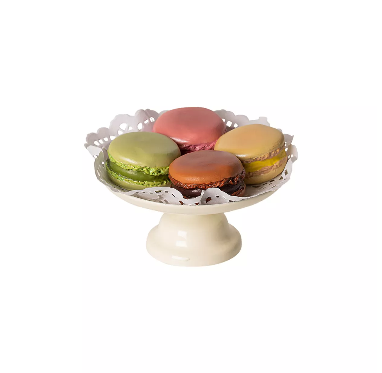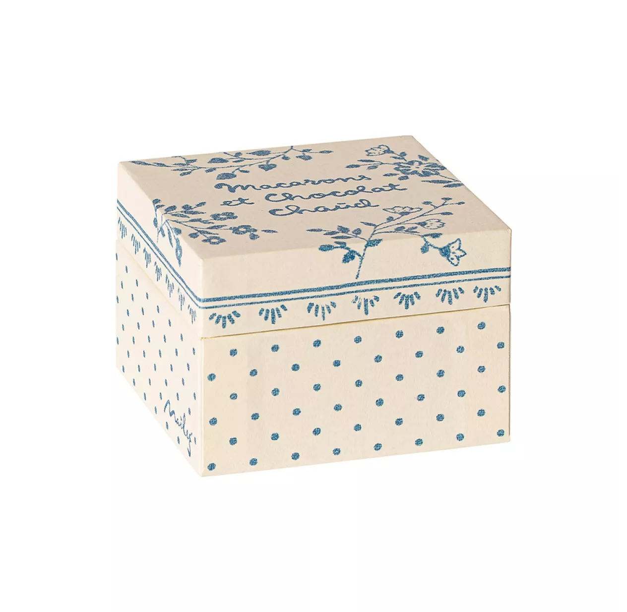 Cette petite boîte en carton comprend tout le nécessaire pour partager un goûter entre petites souris ! Un ensemble de 4 macarons disposés dans un joli plat sur pied et agrémenté d’un napperon en dentelle de papier. Le monde miniature de Maileg qui rappelle celui de Cendrillon, de Basile Détective ou encore de Ratatouille, est tout en minutie, détails et poésie. Un univers à compléter au fil des années, au fur et à mesure que votre enfant grandit, au fil des collections et de vos envies. Rétro, belles, poétiques et un brin désuètes, les créations Maileg sont des jouets qu’on a plaisir à offrir aux enfants tant ils nous rappellent nos jouets d’antan !