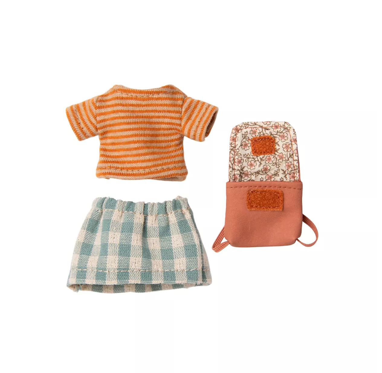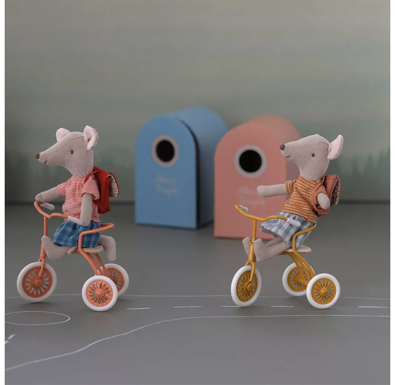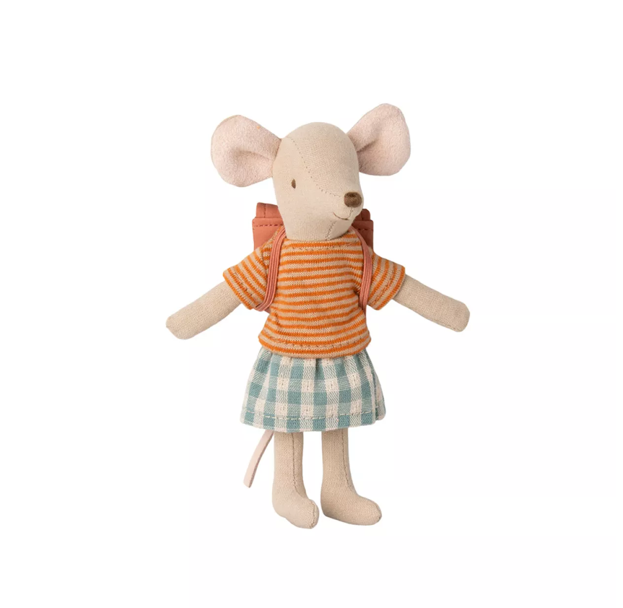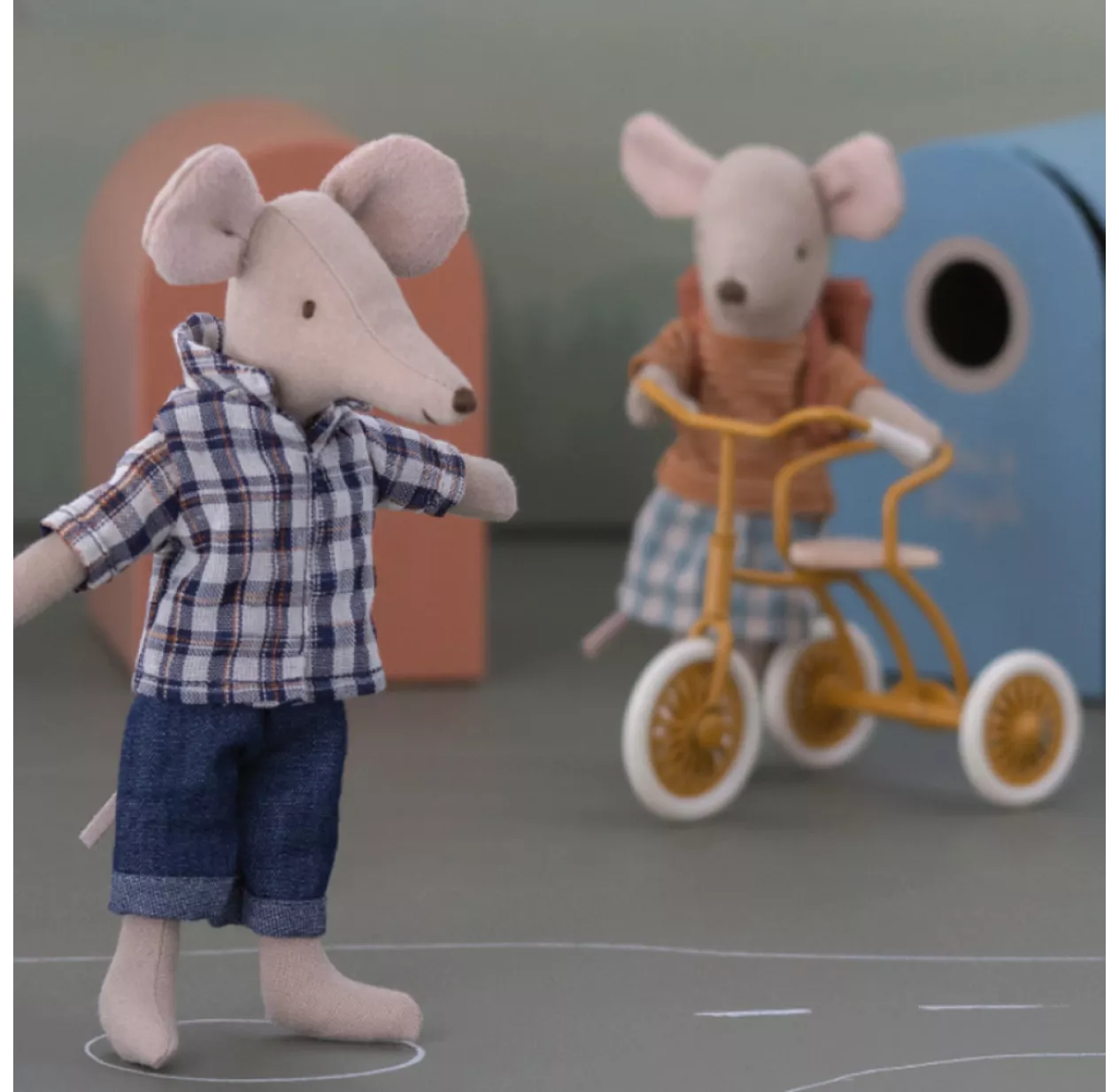 Dans la famille Souris de Maileg, je voudrais la grande soeur… Mais cette fois, dans la version cycliste ! Cette grande soeur souris est Ă croquer, elle porte une Ă©lĂ©gante tenue de rentrĂ©e constituĂ©e d’une jupe, d’un t-shirt rayĂ© et d’un cartable d’Ă©colier. Toute sa tenue est amovible. Bref, de quoi ĂŞtre fière d’ĂŞtre une grande soeur non ? Un cadeau merveilleux au parfum d’antan parfait pour un enfant entre 3 et 7 ans, mais il pourrait bien faire craquer les plus grands : ) Une petite fille souris toute en finesse, taillĂ©e dans une jolie toile de lin Ă©crue, ses finitions sont très soignĂ©es. On craque pour la texture de ses oreilles et sa petite queue en simili cuir. Cette petite souris mesure 13 cm de haut. Il s’agit de la grande version (Big) des souris Maileg. A associer avec les souris Baby (mini 8 cm de haut) et Little (10 cm de haut).