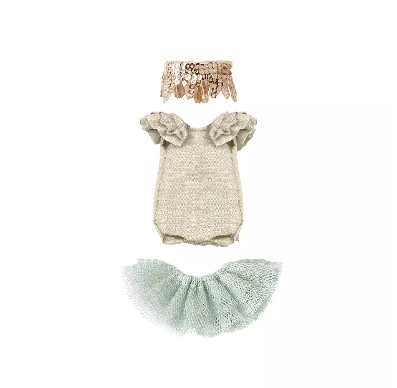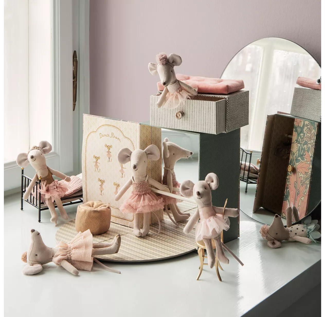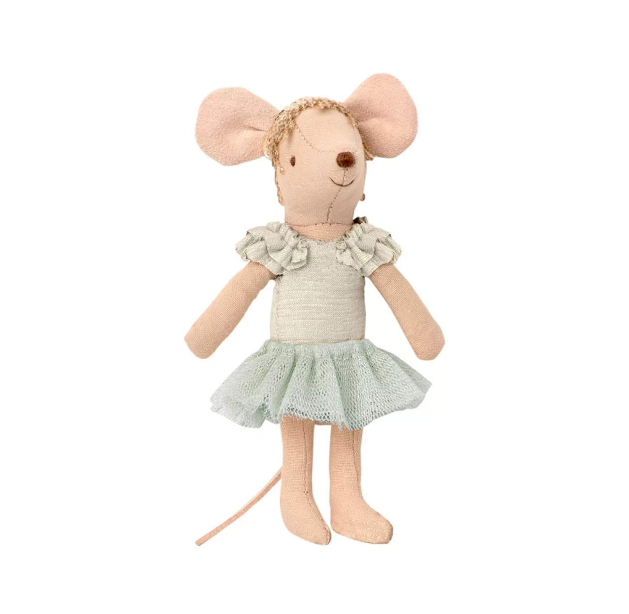 Dans la famille Souris de Maileg, je voudrais la grande soeur… Mais cette fois, dans la version ballet ! La souris Danseuse grande soeur de Maileg est Ă croquer. Elle porte un Ă©lĂ©gant costume du Lac des Cygnes bleu clair constituĂ© d’un justaucorps Ă Ă©paulettes, d’un tutu assorti et d’une coiffe Ă sequins argentĂ©s. Toute sa tenue est amovible. Elle arrive dans une jolie boĂ®te cadeau en carton. Bref, de quoi ĂŞtre fier d’ĂŞtre une grande soeur non ? Un cadeau merveilleux au parfum d’antan parfait pour un enfant entre 3 et 7 ans, mais il pourrait bien faire craquer les plus grands : ) Une petite fille souris toute en finesse, taillĂ©e dans une jolie toile de lin Ă©crue, ses finitions sont très soignĂ©es. On craque pour la texture de ses oreilles et sa petite queue en simili cuir. Cette petite souris mesure 12 cm de haut. Il s’agit de la grande version (Big) des souris Maileg. A associer avec les souris Baby (mini 8 cm de haut) et Little (10 cm de haut).