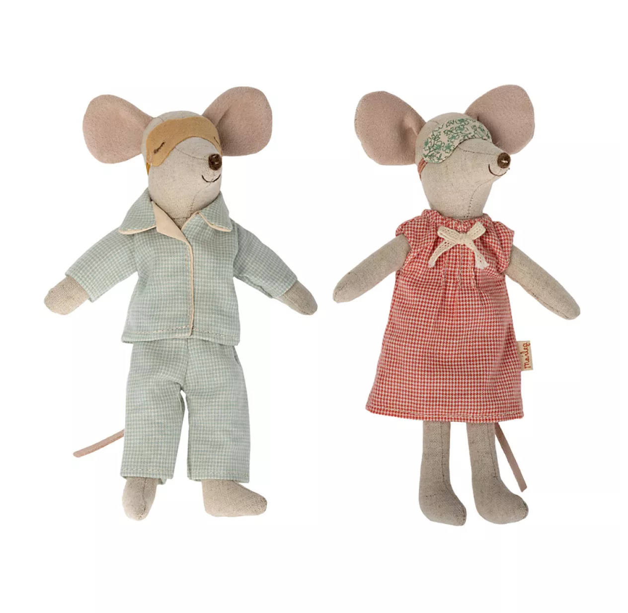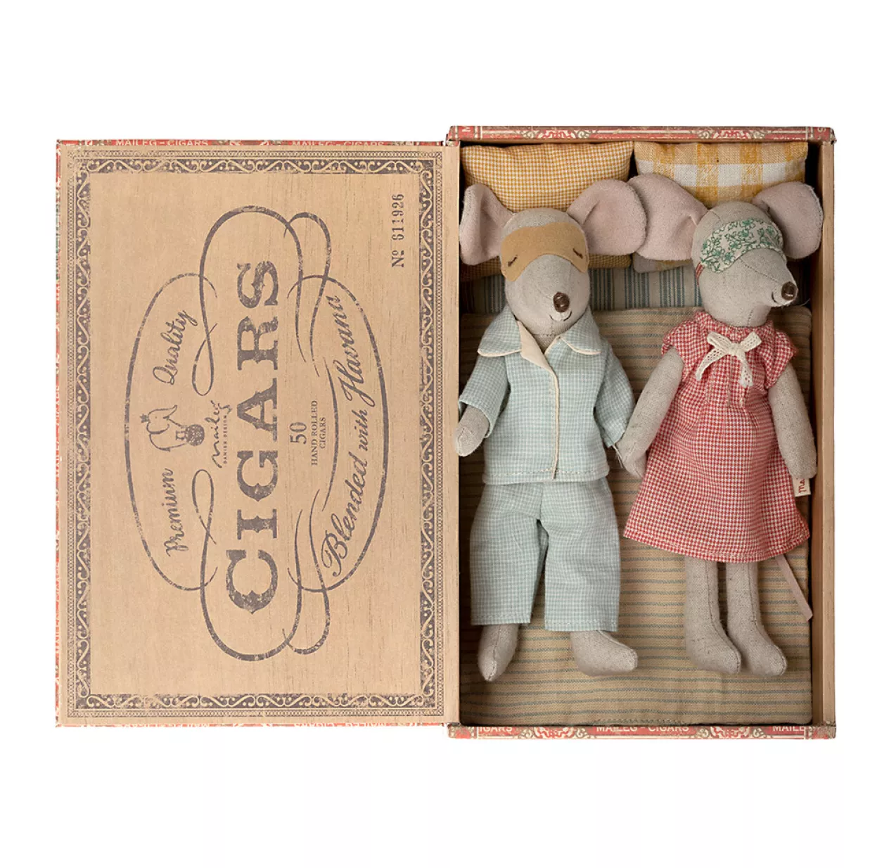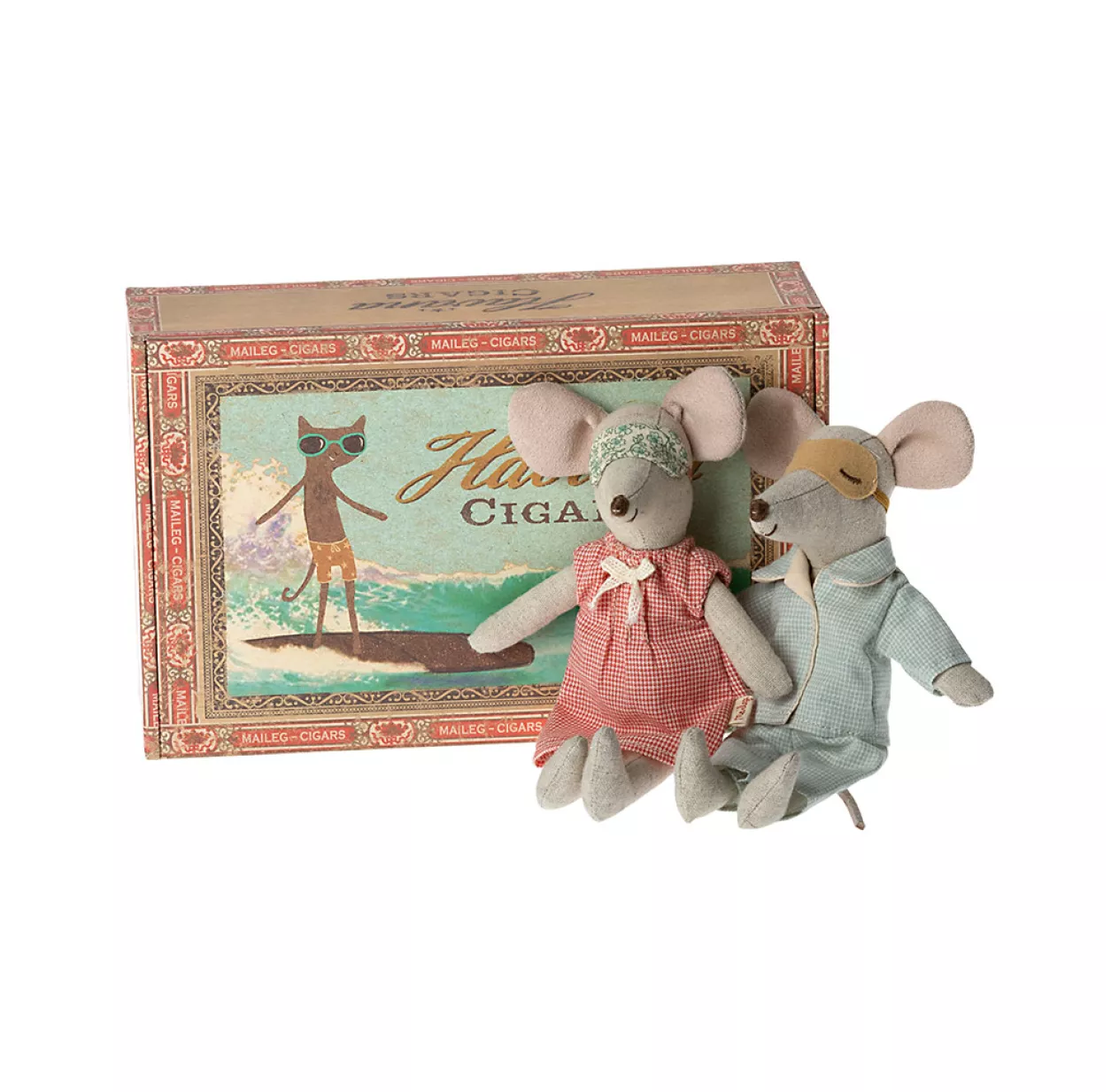 Sans doute le cadeau le plus craquant au monde : ) Cet adorable couple de parents souris Maileg semble tout droit sortie d’un dessin animé. Comme d’habitude chez Maileg, ces souris arrivent dans leur boîte qui leur fait office de lit. Cette fois, c’est une boîte à cigares rétro. Toutes en finesse, elles sont élégamment vêtues. Taillées dans une jolie toile de lin écrue, leurs finitions sont très soignées. On craque pour la texture de leurs oreilles et leur petite queue en simili cuir. Cette deux grandes souris mesure 13 cm de haut. A associer avec les souris Little (petite 10 cm de haut) et Big (12 cm de haut).