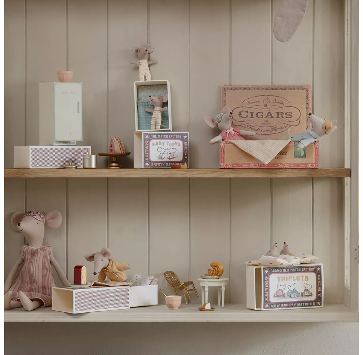 Maileg est une marque danoise créé en 1999 par la designer Dorthe Mailil. Connue pour ses illustrations poétiques très reconnaissables, Dorthe imagine des collections de jouets uniques et authentiques, à l’image de son univers graphique. Le monde merveilleux de Maileg ressemble à une forêt enchantée peuplée de lutins, de rennes et biches endormis, de petites souris, de grands lapins et même de chats et chiens.