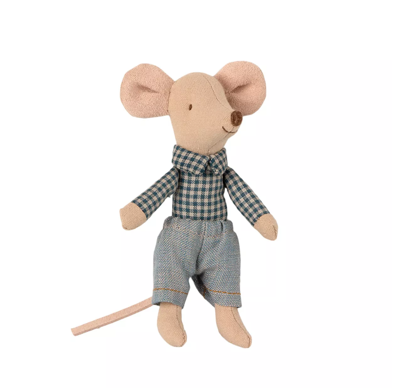 Dans la famille Souris de Maileg, je voudrais le petit frère… La souris petit frère de Maileg est à croquer. Elle porte une élégante chemise vichy et arrive dans sa boîte d’allumette équipée d’un matelas et d’une couverture. Bref, de quoi être fier d’être un petit frère non ? Un cadeau merveilleux au parfum d’antan parfait pour un enfant entre 3 et 7 ans, mais il pourrait bien faire craquer les plus grands : ) Un petit garçon souris tout en finesse, taillé dans une jolie toile de lin écrue, ses finitions sont très soignées. On craque pour la texture de ses oreilles et sa petite queue en simili cuir. Cette petite souris mesure 10 cm de haut. Il s’agit de la petite version (Little) des souris Maileg. A associer avec les souris Baby (mini 8 cm de haut) et Big (12 cm de haut).