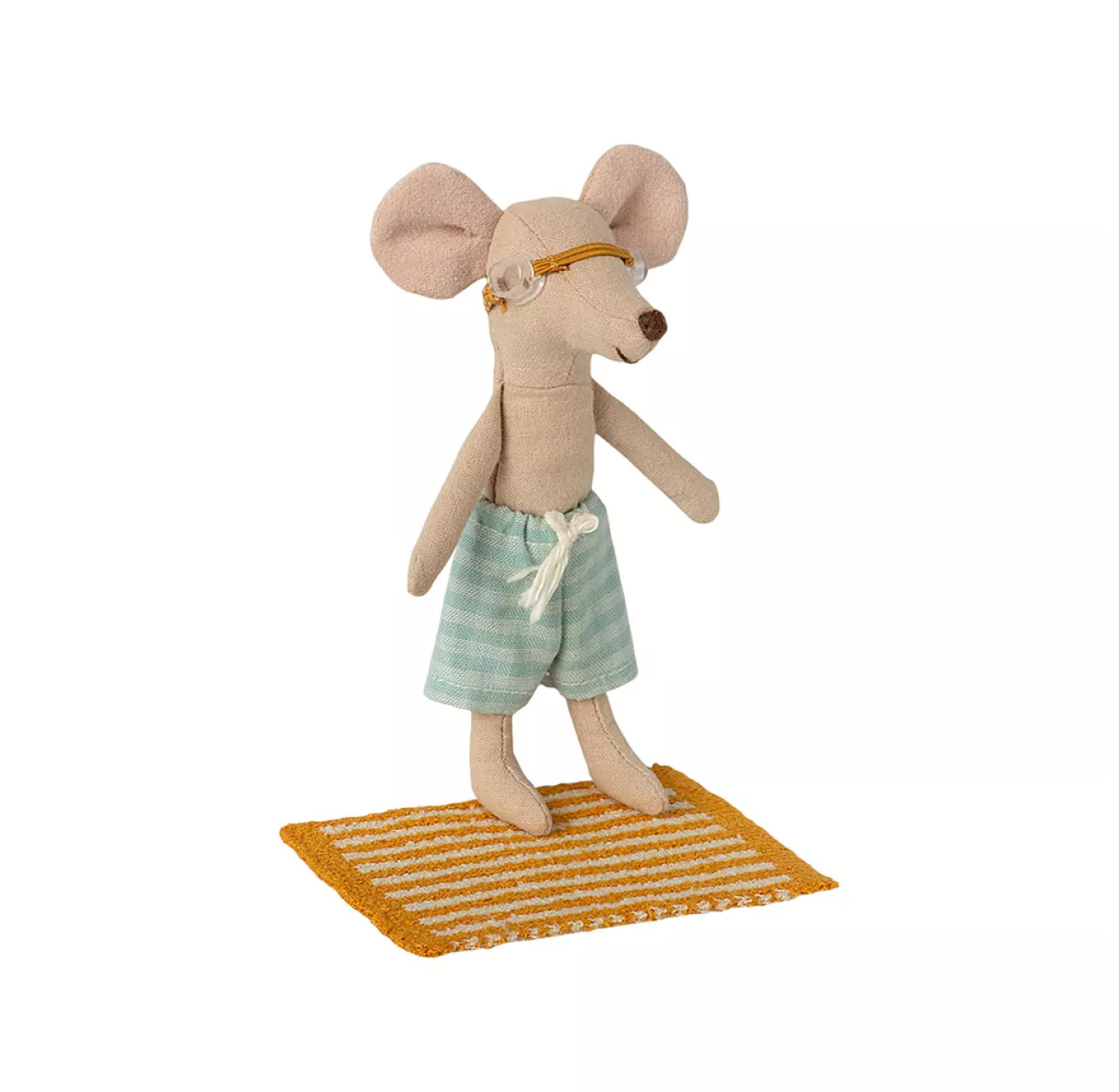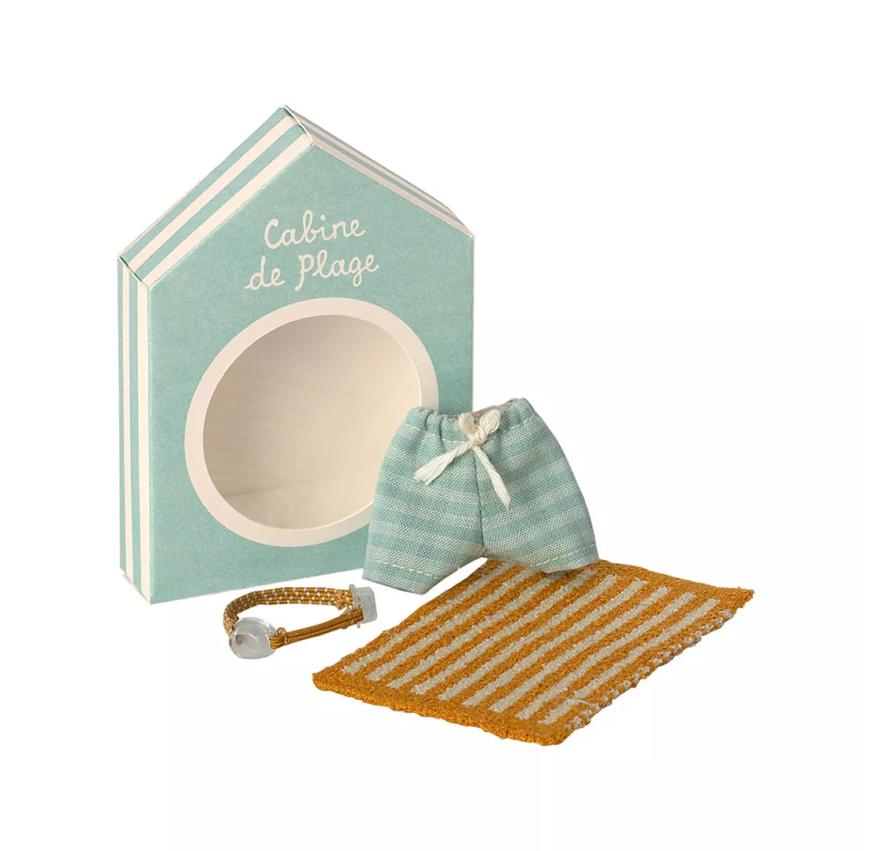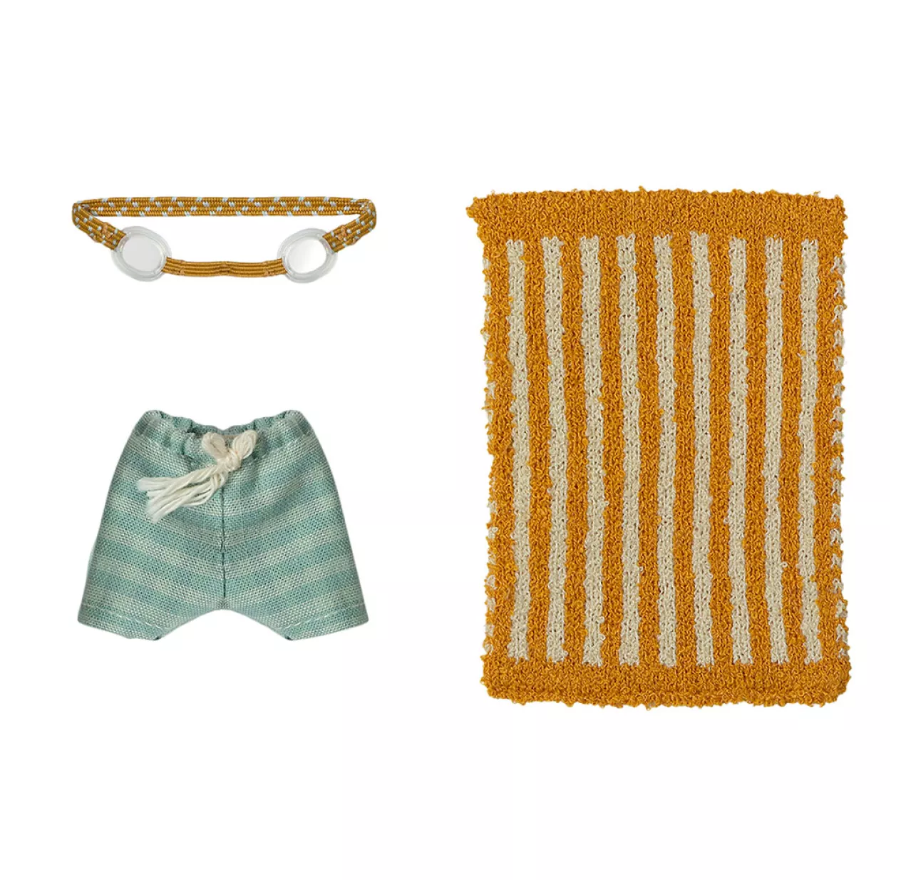 Cette tenue de plage Maileg constituée d’un short de bain, de lunettes de plongée et d’une serviette éponge sera un indispensable des grands frères souris cet été ! Un set de plage imaginé pour compléter l’univers poétique de vos petites souris Maileg. Il appartient à la collection Maileg créée autour de la plage. Vous pourrez lui associer toute la famille des souris en maillots de bain et leur cabine de plage, les transats, matelas de plage, parasol et bouées. Cette année, Maileg assure à toutes les petites souris des vacances en bord de mer réussies !