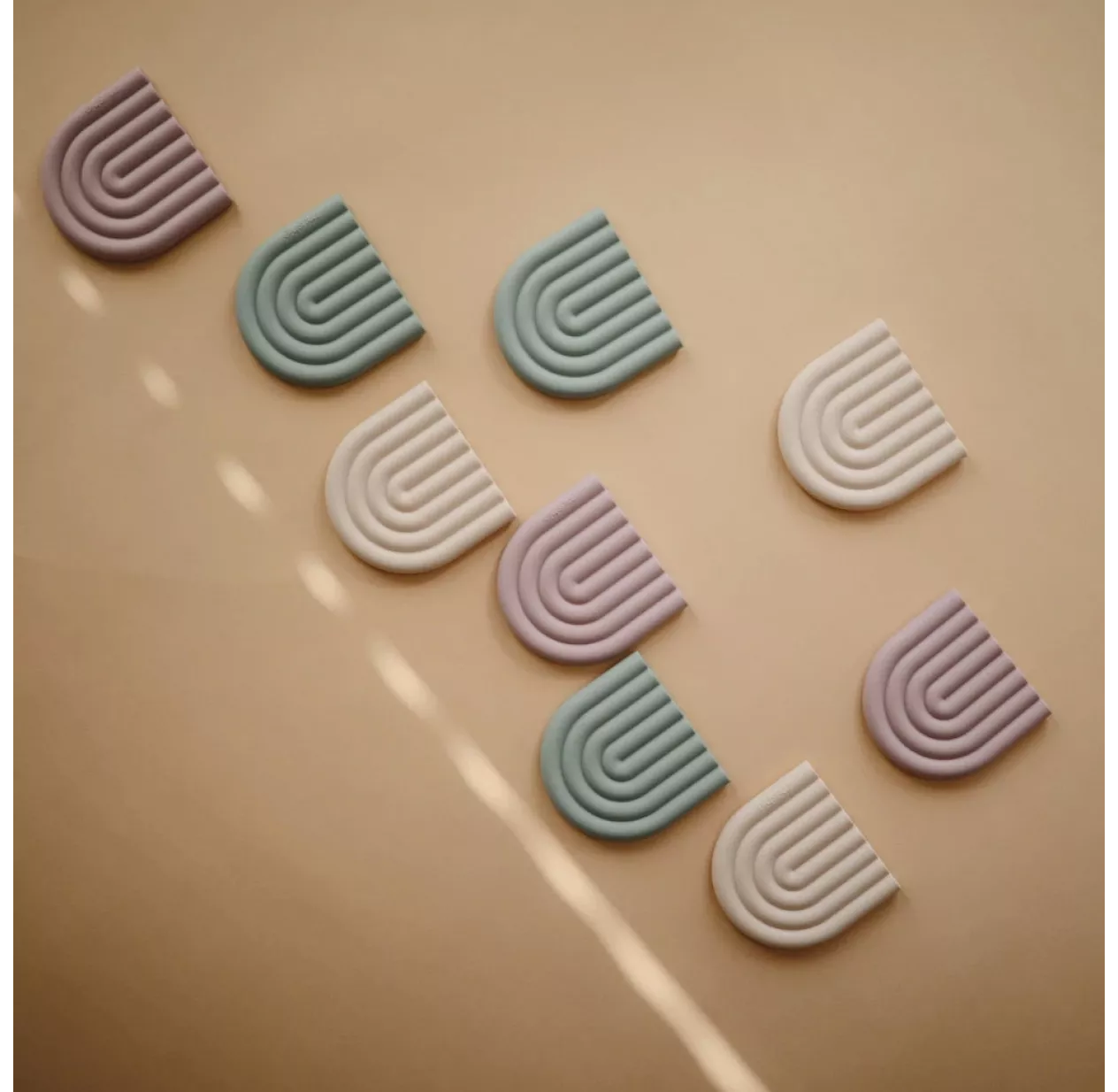 Ce magnifique jouet de dentition en forme d’arc-en-ciel est en silicone alimentaire. On aime son coloris sable délicat et son design à la fois minimaliste et très graphique, qui en fait un objet déco à part entière. Chaque couleur de l’arc-en-ciel est matérialisée par un cylindre qui permet une bonne prise en main et offre une texture idéale pour masser et soulager les gencives de votre bébé. Un jouet de dentition beau et pratique, parfaitement dans la tendance : )