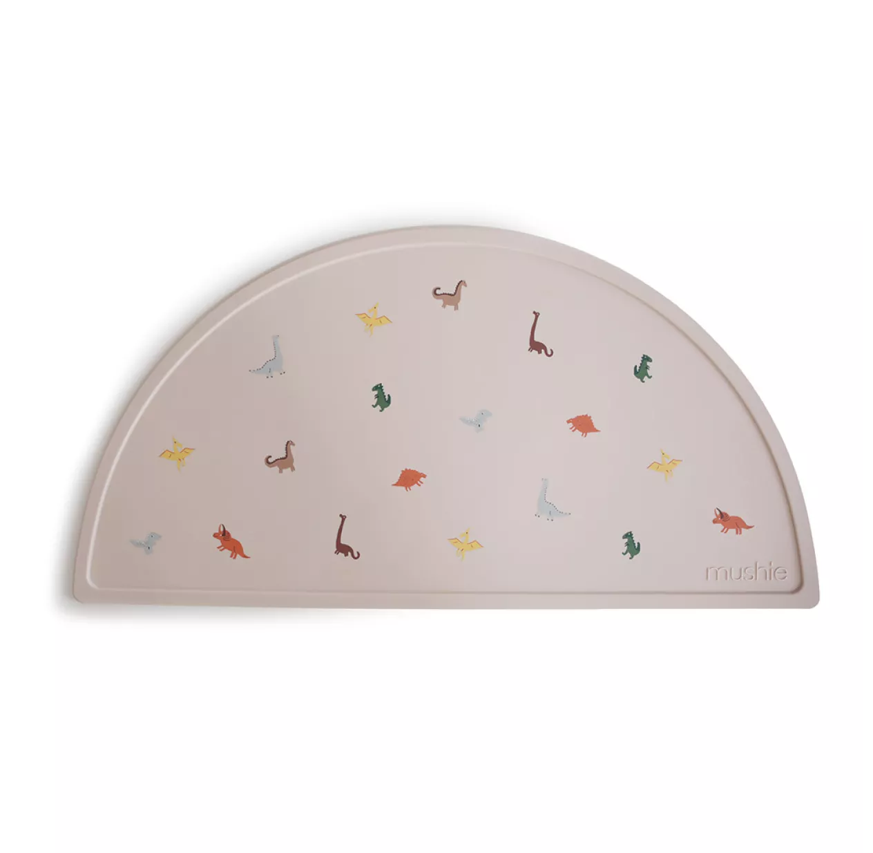 Coup de coeur pour le nouveau set de table Mushie en demi-cercle qui accompagne en beauté votre bébé pour ses premiers repas et jusqu’à ses 5-6 ans. Parsemé de dinosaures multicolores, il est à la fois pratique et beau. Le set de table Mushie est en silicone 100% alimentaire recyclable, sans PVC, sans BPA et sans phtalates.