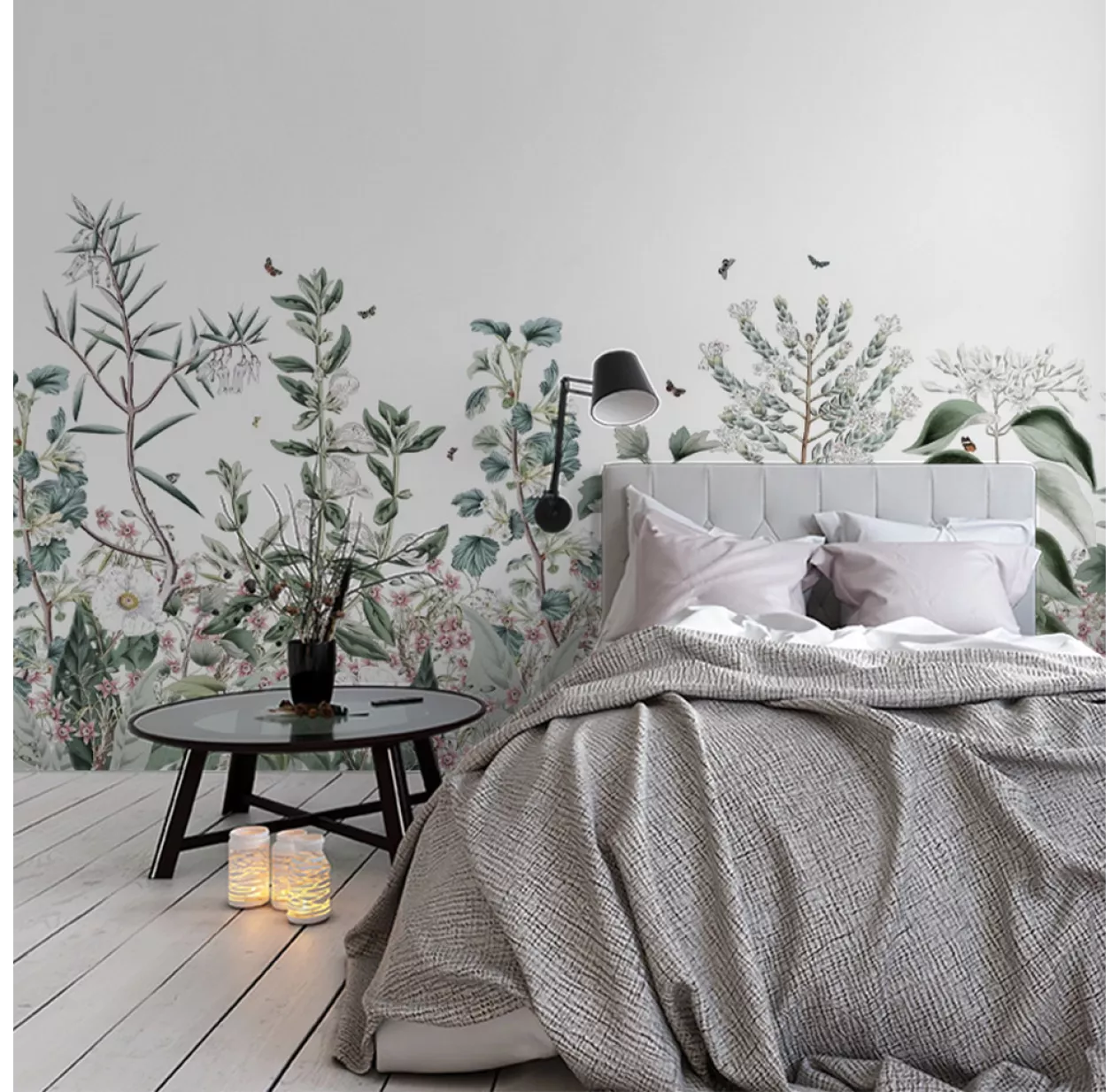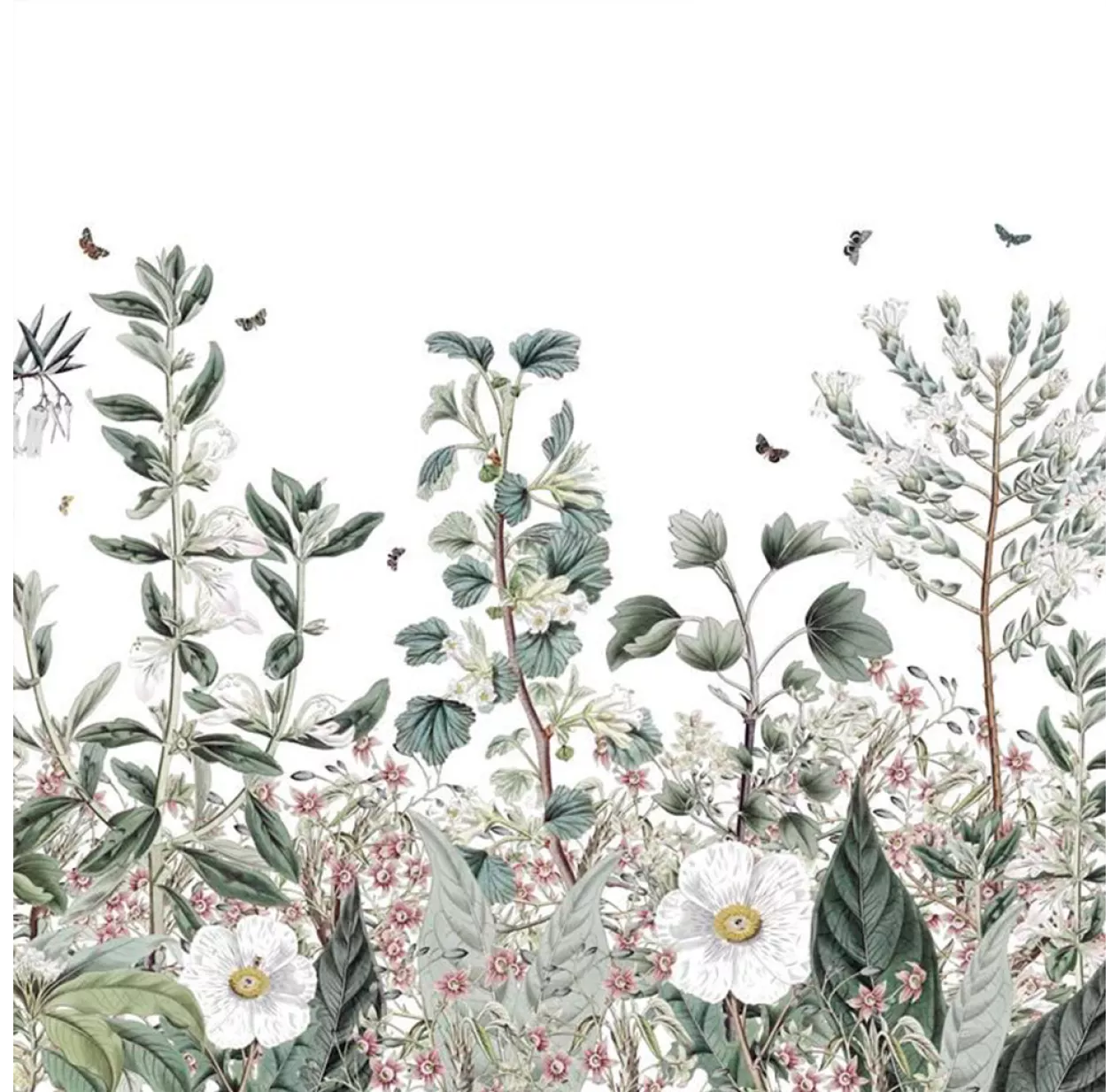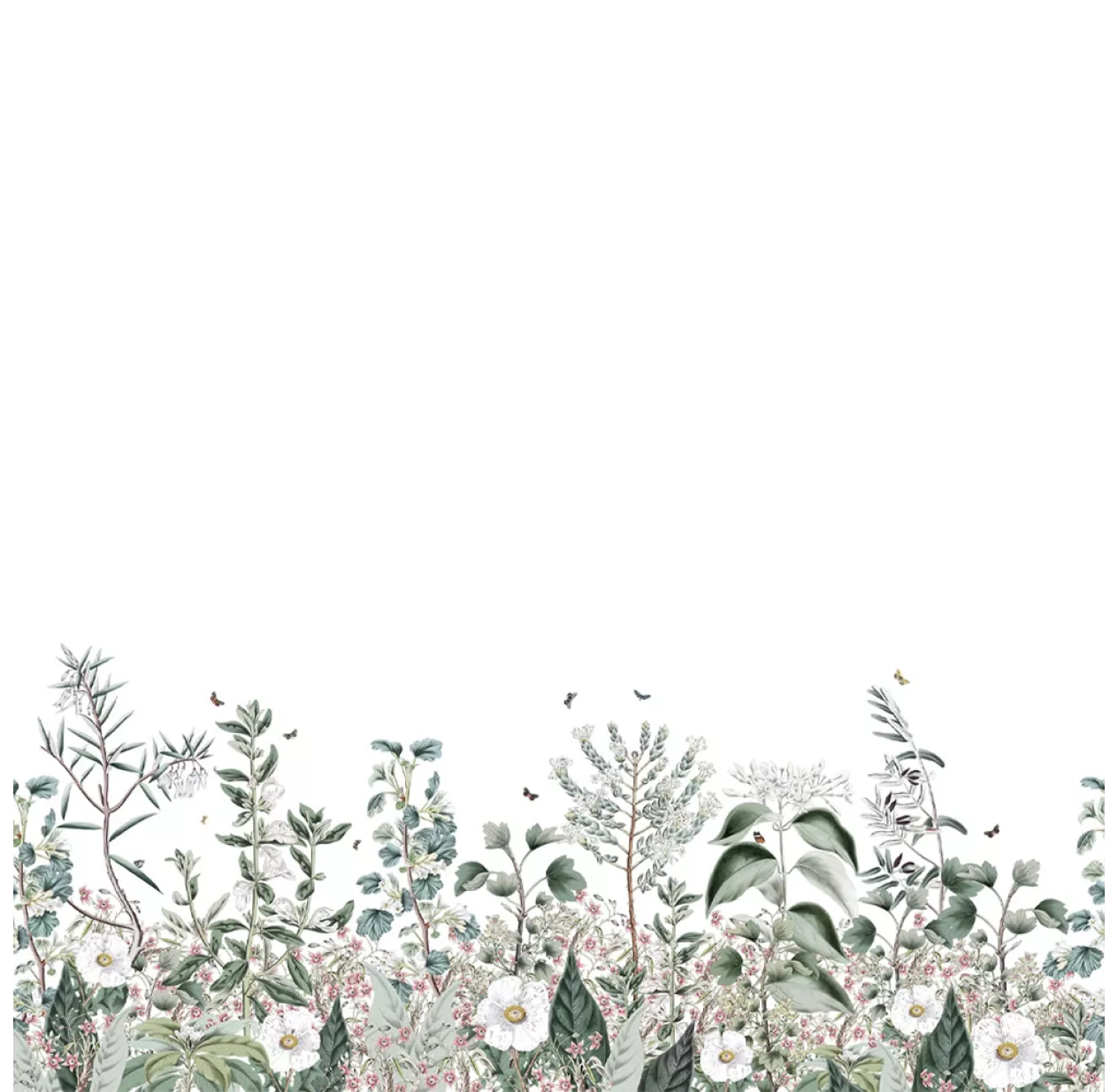 Botanical Garden est une composition florale inspirée de planches d’aquarelles botaniques. Une grande variété de feuillages et de fleurs se retrouve dans ce décor luxuriant et majestueux autour desquels virevoltent des petits papillons. Une gamme de verts délicats pour une douce invitation de la nature dans sa maison.