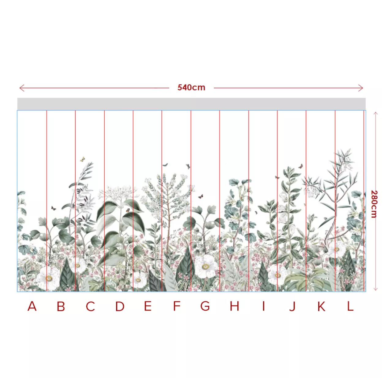 Réalisé sur-mesure pour s’adapter parfaitemet à votre intérieur le décor Botanical Garden se développe sur 3 à 8 lés de 70 cm de largeur. Vous pouvez donc couvrir un mur entre 2,10 m et 5,40 m de large et sur une hauteur allant jusqu’à 2,80 m. Nous vous conseillons de prévoir 5 cm en plus sur votre largeur et sur votre hauteur (ce sont les marges de sécurité). Vous serez contacté par notre Service Client dès la validation de votre commande pour définir les lés que vous souhaitez (identifiés par des lettres de A à L sur le visuel de la fiche technique).