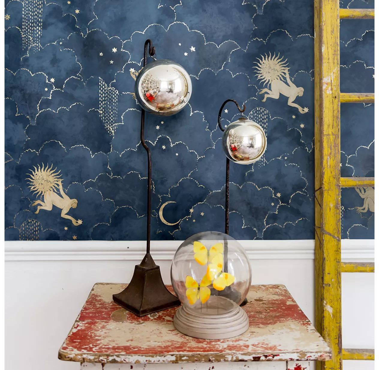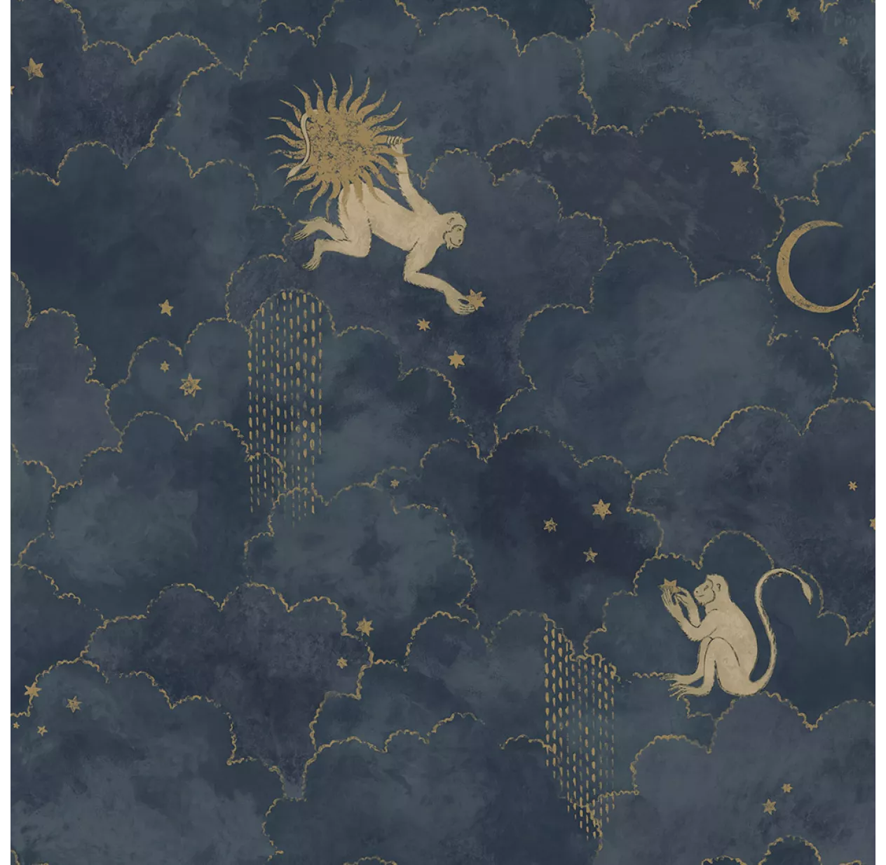 Pour ce décor Stars and Monkeys, Shauna Dennison s’est inspirée de William Turner pour son utilisation de la peinture et de la texture. Dans un ciel aux nuages cotonneux de couleur bleu nuit et aux contours dorés, les éléments célestes, le soleil, la lune et les étoiles, tous dorés, se sont donné rendez-vous. Dans ce paysage onirique, des petits singes malicieux dorés, inspirés des peintures indiennes semblent jouer avec les étoiles et donnent l’impression d’être en apesanteur. Cette scène poétique est une très belle option pour une chambre d’enfant onirique.