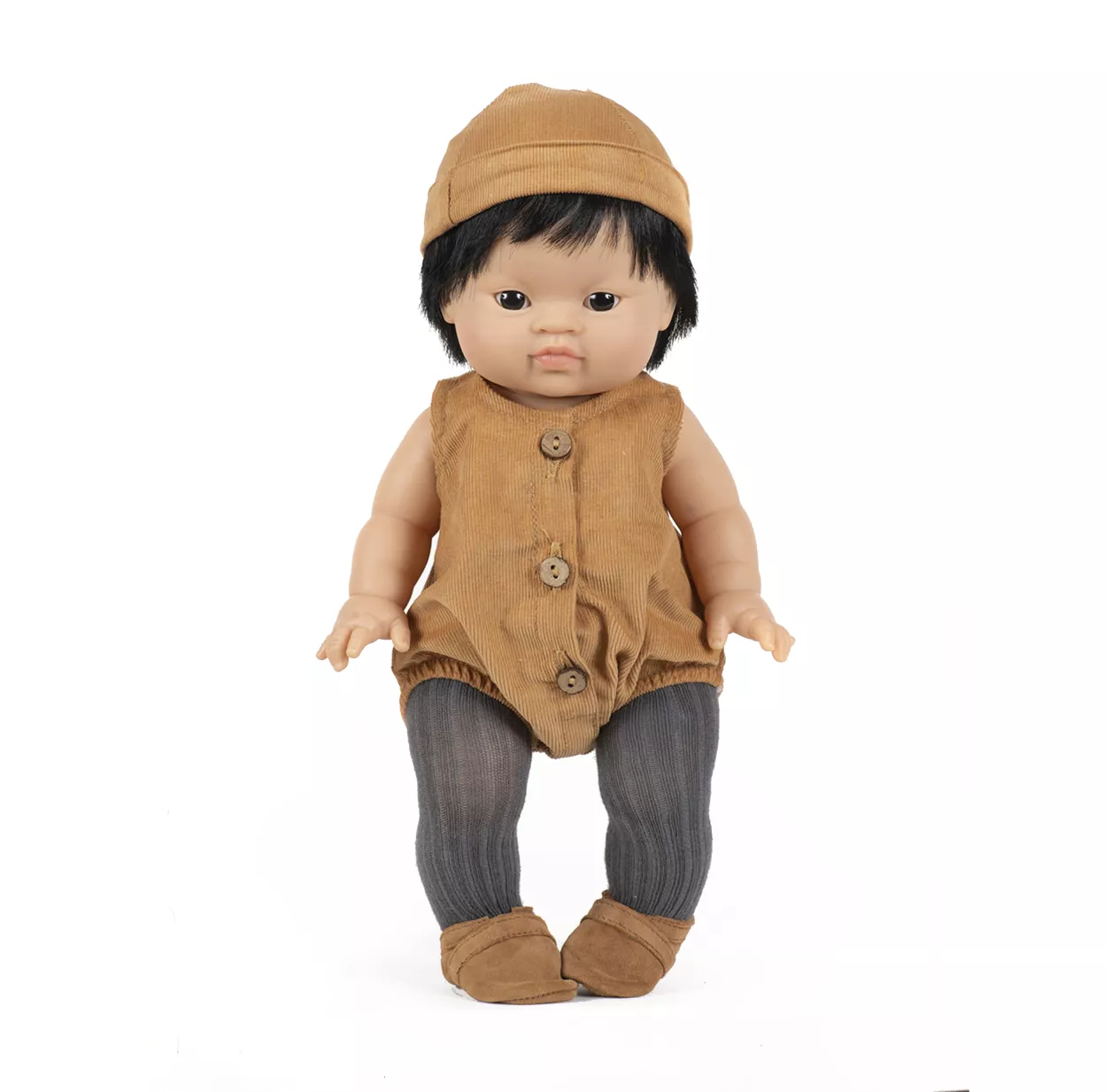 Le poupon à cheveux Jude Gordis de Minikane a revêtu son adorable barboteuse en milleraie, son bonnet assorti, ses collants Collégien gris ardoise et ses slippers en daim marron pour un ensemble à croquer. Ce petit garçon asiatique aux yeux brun est livré habillé. Chez Les Enfants du Design nous sommes fans du poupon Gordis qui a trouvé chez Minikane son plus joli vestiaire ! En PVC souple délicatement parfumé à la vanille, ce poupon est fabriqué en Espagne.