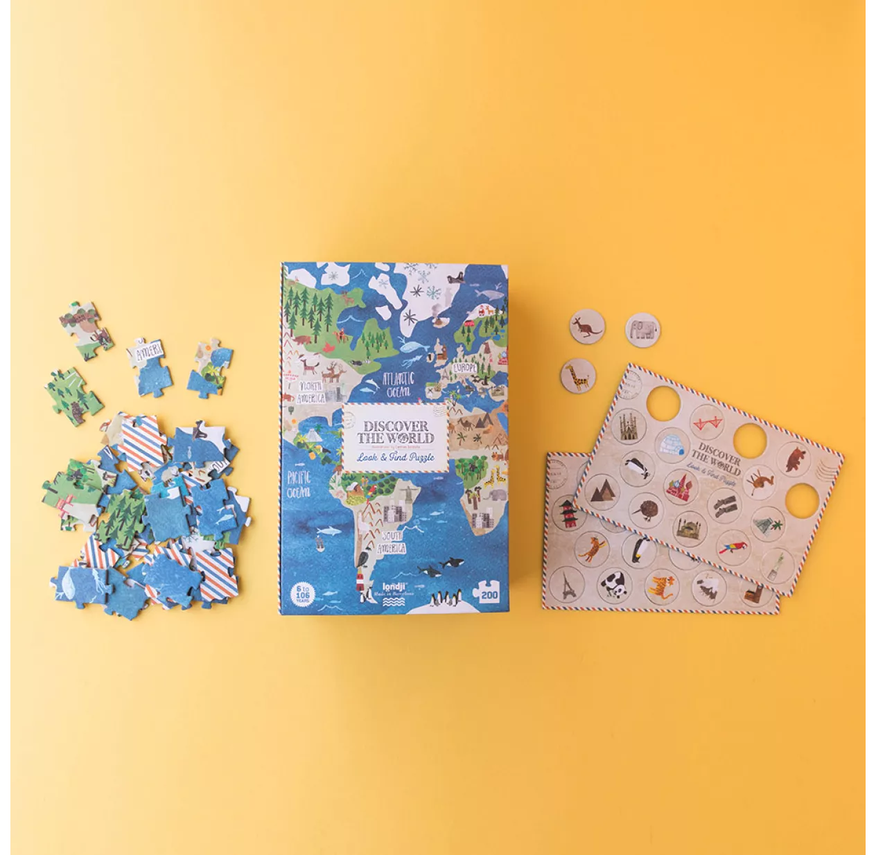 Le puzzle Discover the World de Londji est un magnifique puzzle de 200 pièces accompagné de 34 jetons d’observation. La grande planète bleue cache de nombreux secrets à découvrir. Vous devez d’abord construire le puzzle avant de vous lancer en quête de la Tour Eiffel, Big Ben ou encore le panda parmi bien d’autres merveilles. Les trouverez-vous toutes ? Un puzzle magnifiquement illustré par Carmen Saldañ.