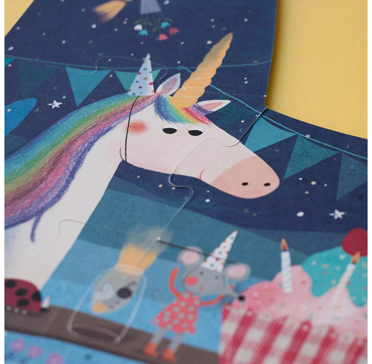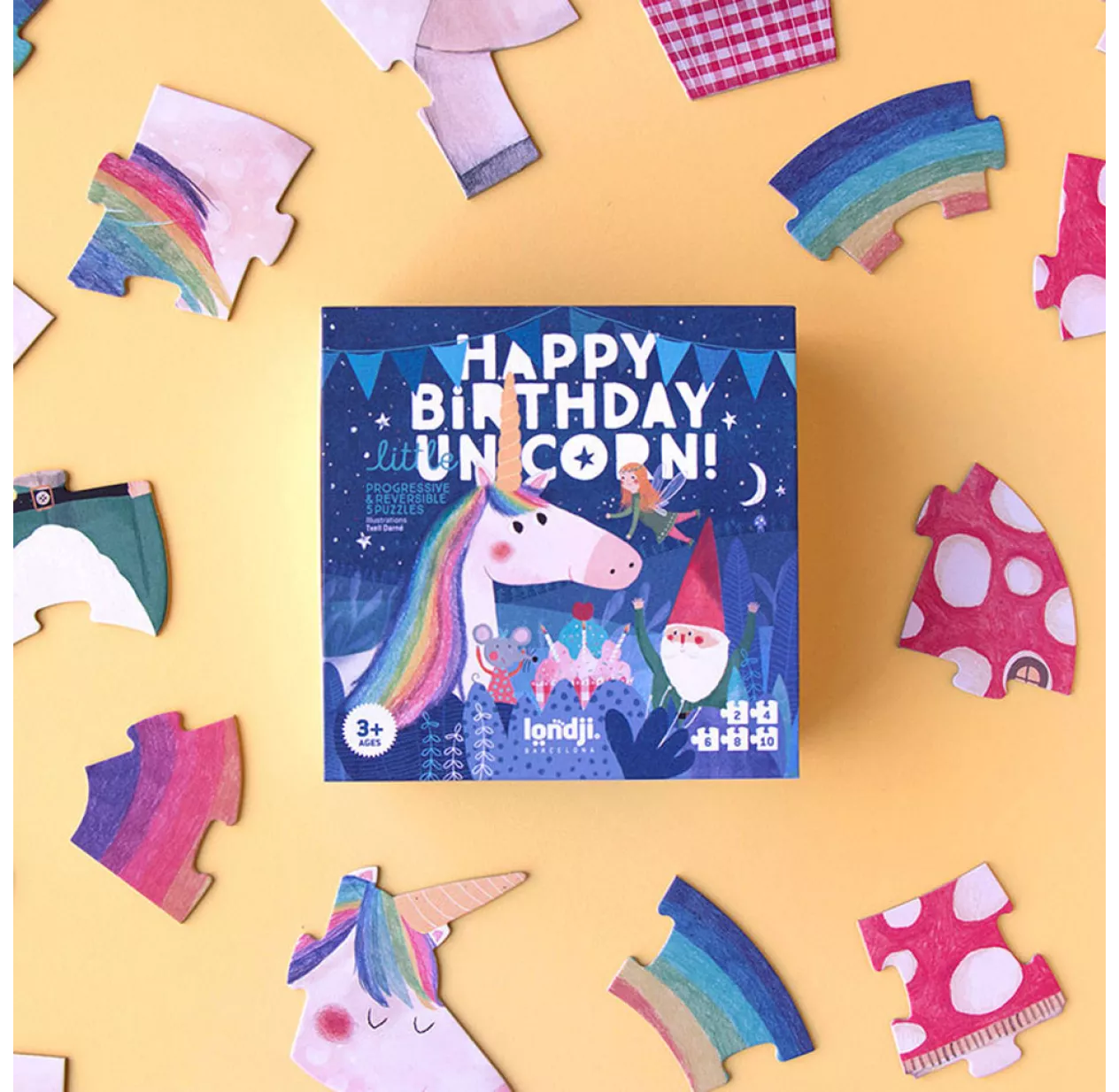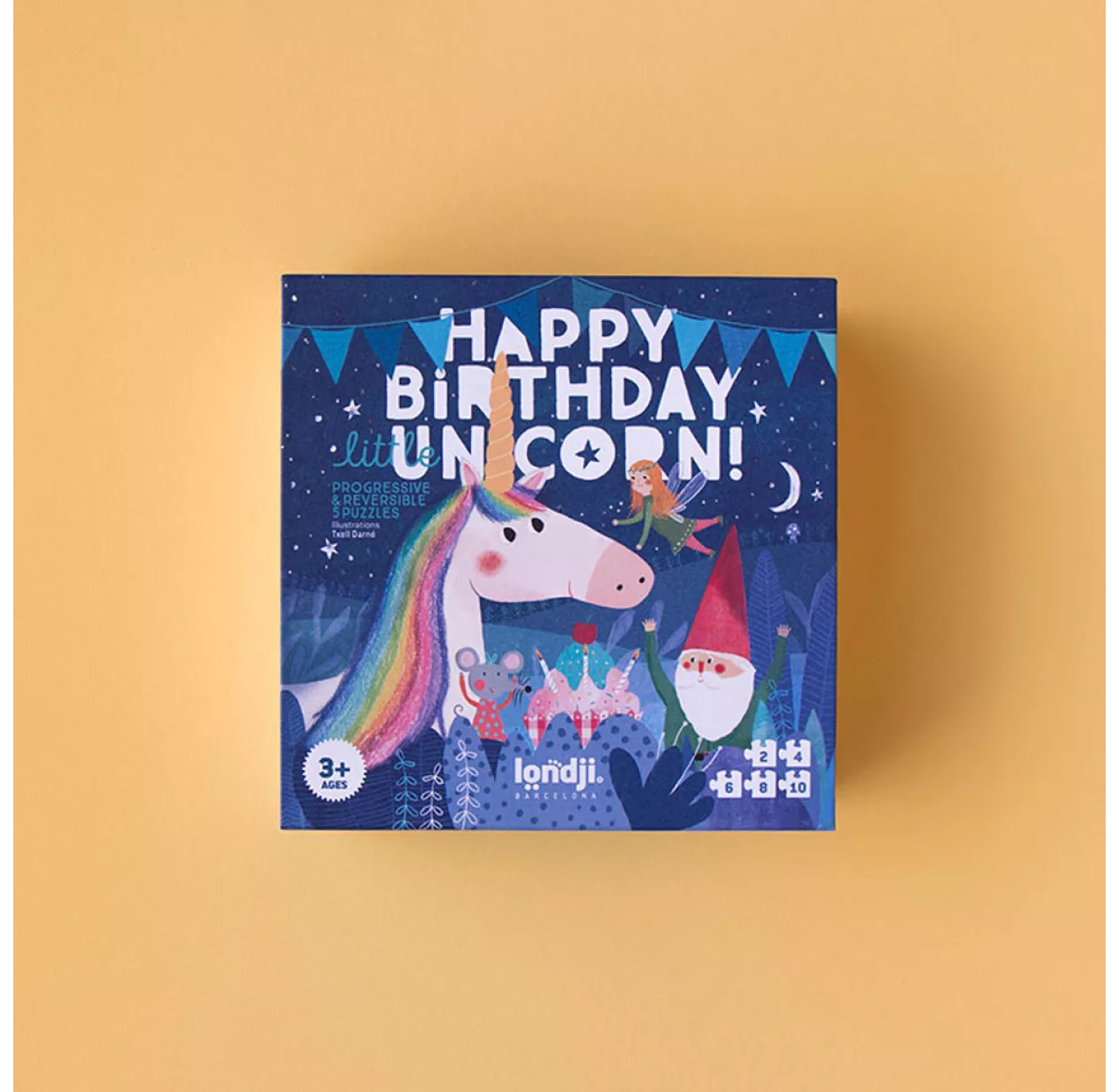 Le set de puzzles Happy Birthday Unicorn est composé de 5 puzzles réversibles ! Ce soir, quand le soleil se couchera, nous fêterons l’anniversaire de la licorne. Je t’attends dans 10 minutes à la maison du lutin, on te prépare un gâteau et un joli cadeau !