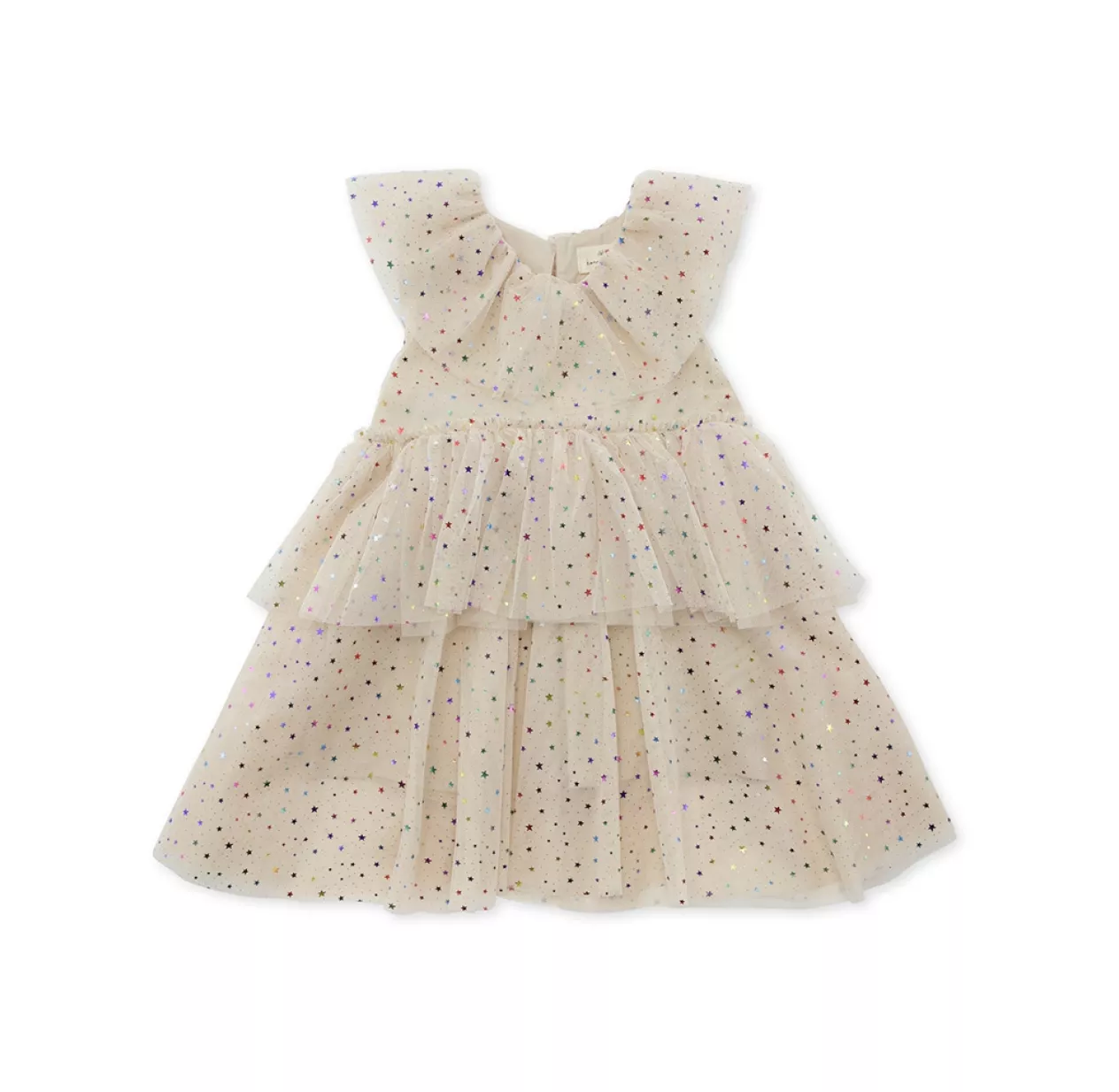 Cette adorable robe de fée faite d’une superposition de volants en tulle écru est parsemée d’étoiles multicolores. Craquante et raffinée, elle habille vos fées de 12 mois à 12 ans pour des fêtes étoilées ! Un incontournable de votre malle à déguisement dans une version particulièrement élégante et actuelle !