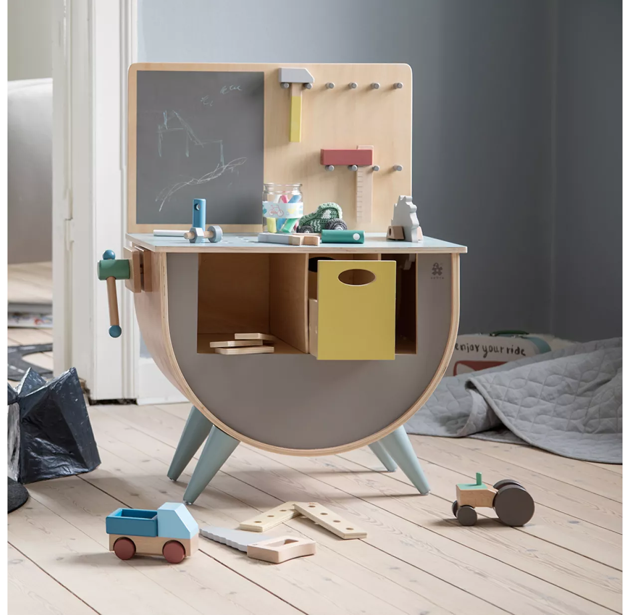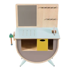 L’établi Sebra va fait de bonheur de vos petits bricoleurs en herbe ! Son plan de travail hyper réaliste dispose d’une scie circulaire. Tous les détails sont réalisés en contreplaqué. L’établi dispose d’un tiroir où ranger vis et boulons. Une crédence permet à l’enfant de suspendre des outils et un tableau sur lequel il pourra écrire à la craie.