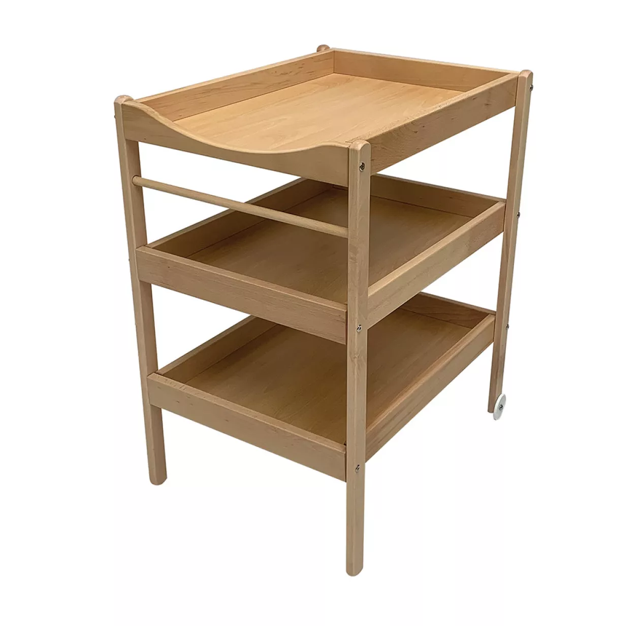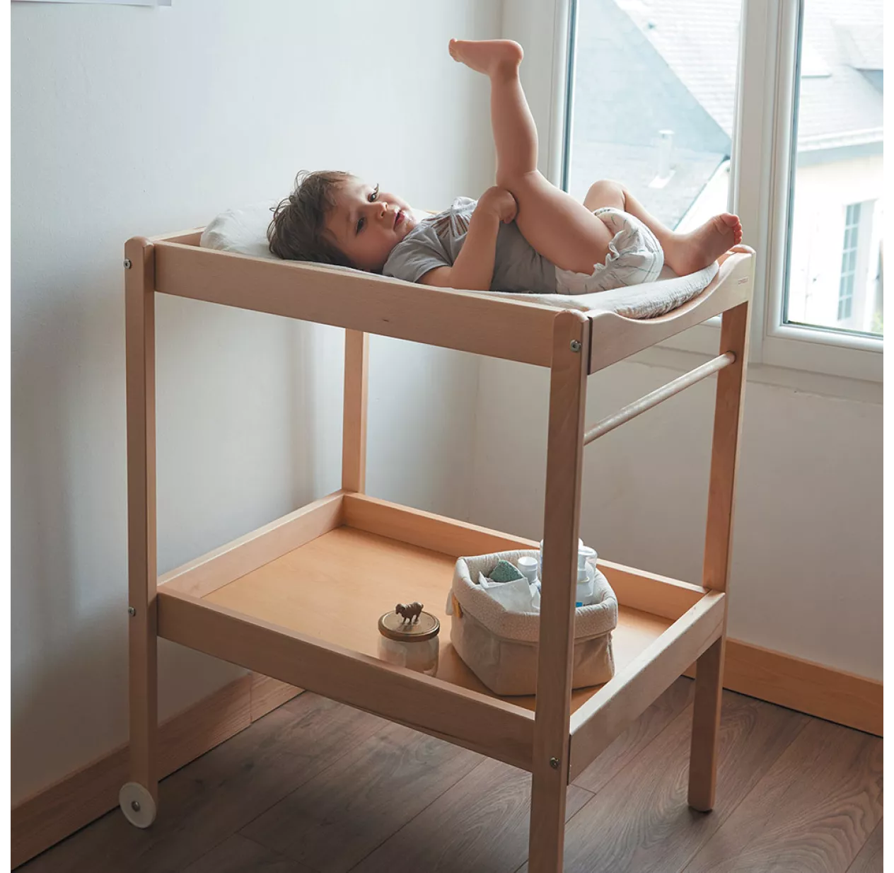 La nouvelle table à langer Margot de Combelle offre une plus grande modularité. Toujours équipée de 3 plateaux et d’un porte-serviette, la table à langer Margot Combelle dispose d’un plateau amovible. Ses 2 plateaux inférieurs offrent de vastes rangements pour organiser votre table à langer et vous faciliter la toilette de bébé. La table à langer Margot dispose également de 2 roulettes arrière pour un déplacement plus aisé. Ses dimensions standards vous permettent de lui associer le matelas à langer de votre choix. Elle convient aux bébés de la naissance jusqu’à 12 mois ou 11kg maximum. Nous avons sélectionné la table à langer Margot Combelle pour sa qualité de conception, son design sobre, son prix attractif et sa fabrication 100% française ! Autre atout et non des moindres, le bois de hêtre utilisé pour la fabrication de la table à langer Combelle provient de la filière bois du Cantal et départements limitrophes. Il en ressort une gestion forestière responsable compatible avec les équilibres écologiques (certification PEFC).