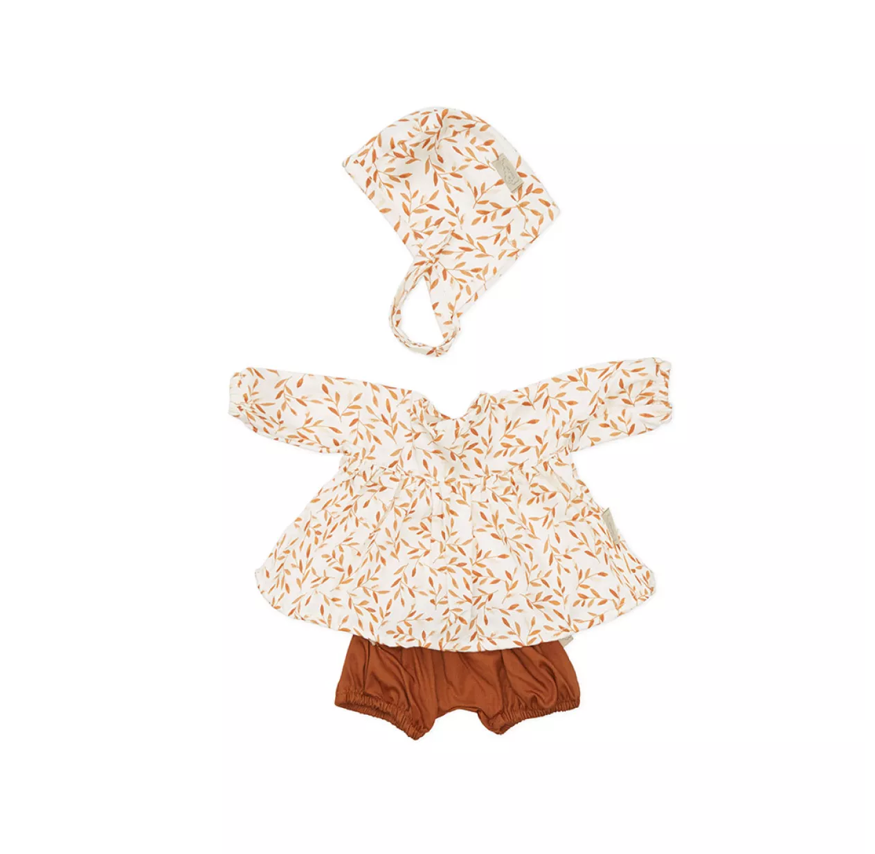 En complément du mobilier et des adorables accessoires pour poupon développés par Cam Cam, la marque a imaginé un petit vestiaire pour poupée absolument craquant. Cette tenue complète comprend un beguin, une robe et un bloomer. Elle se décline en plusieurs imprimé Cam Cam, elle arbore ici le nouveau motif végétal Caramel Leaves. Cet ensemble est taillé dans un coton bio. La tenue de poupon Caramel Leaves Cam Cam s’associe au couffin, au set bavoir et couche ou encore à la gigoteuse qui constituent toute une collection craquante imaginée pour pouponner en beauté.